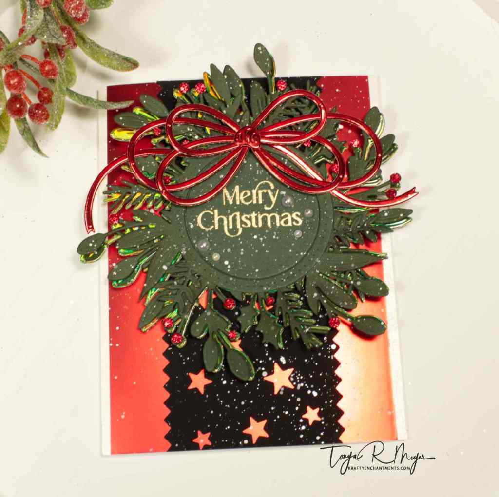 For the sentiment, I used The Merry Christmas from the Tagged Elegance Stamp Set and heat embossed it with gold embossing powder onto the center of the wreath.