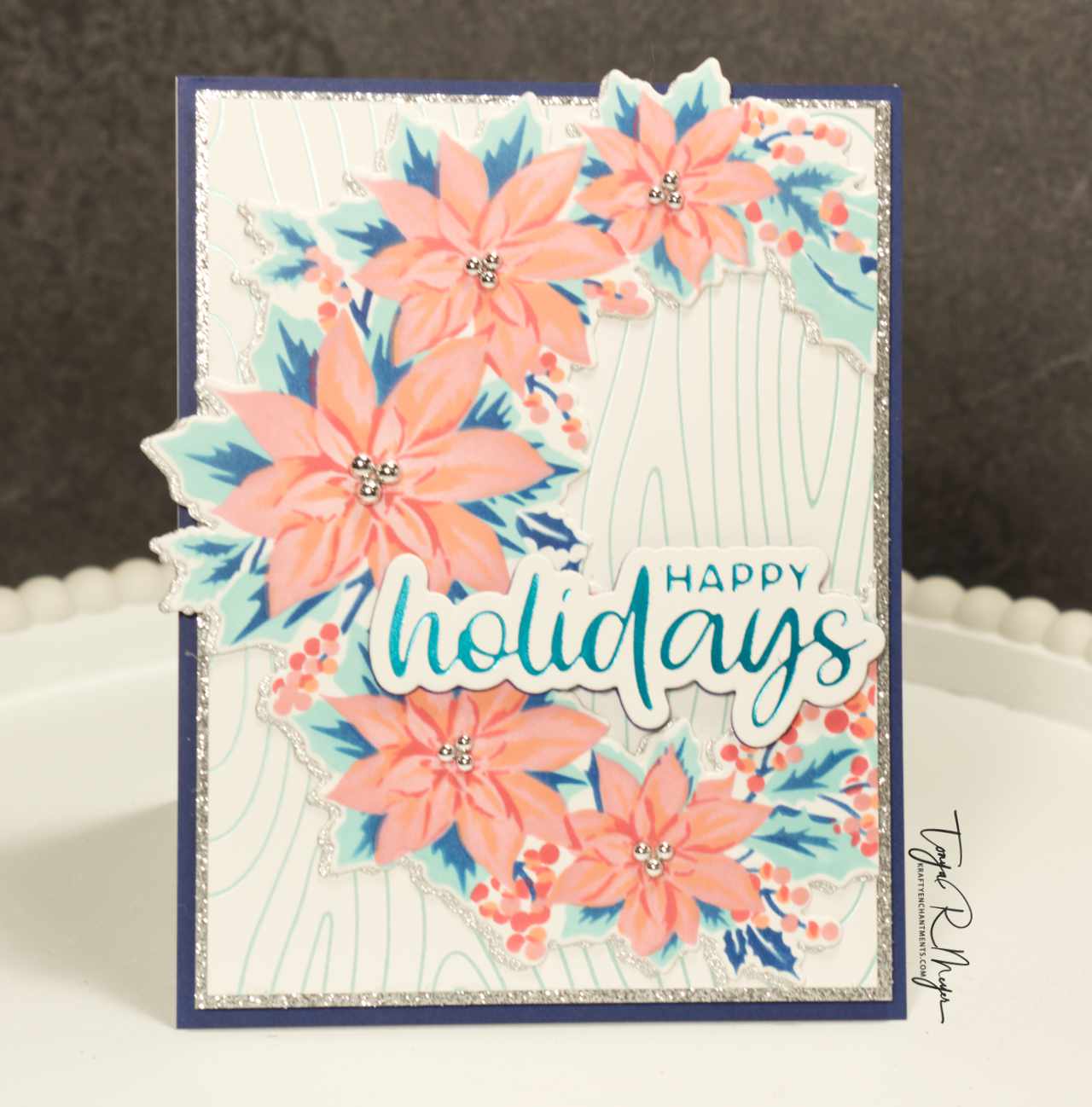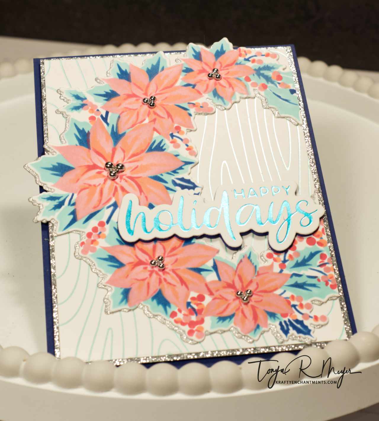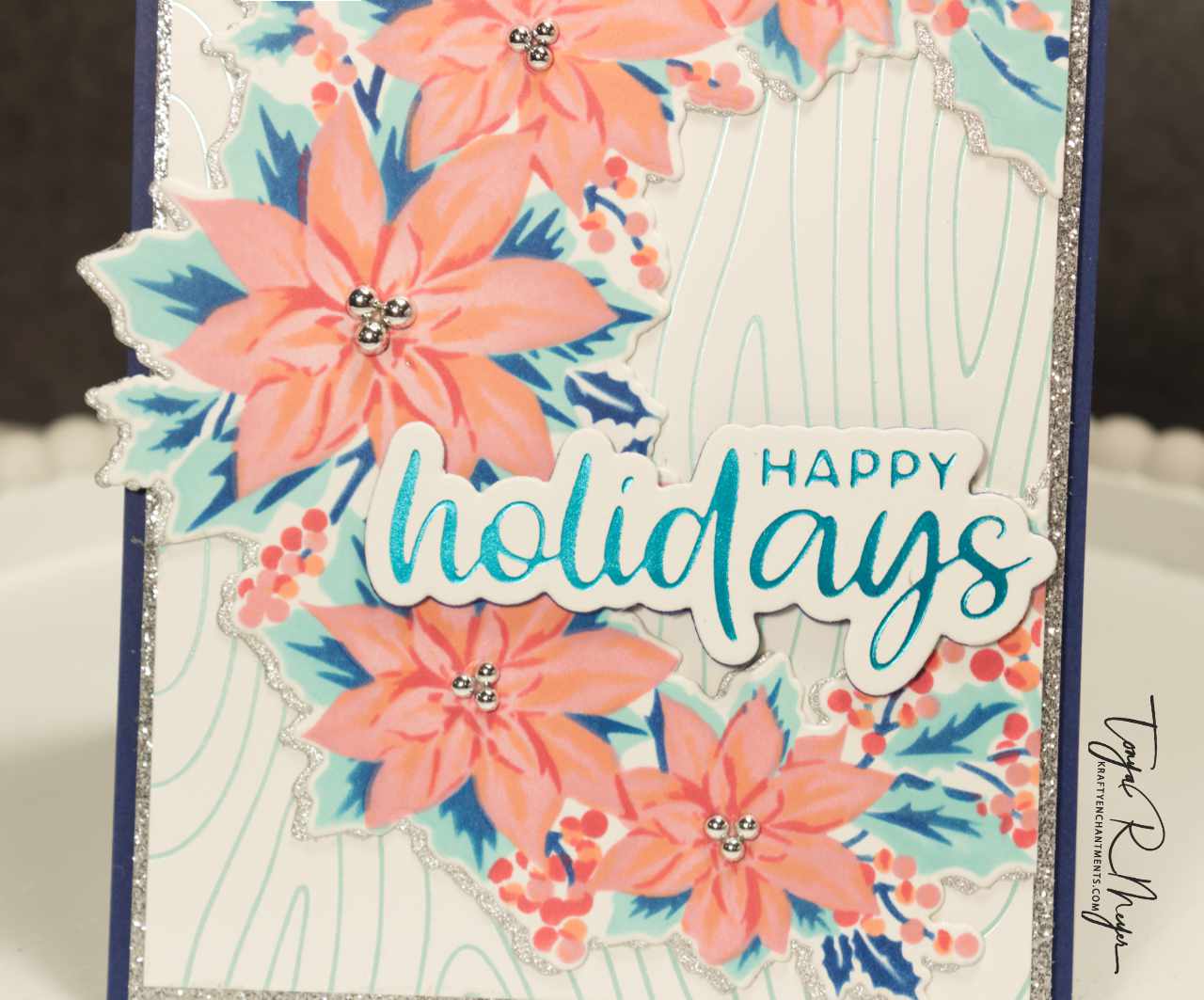 This card features the Poinsettia Wreath Layering stencils. This is a 5 layer stencil and I chose to ink it up with some brightly colored inks from Simon Says Stamp’s Pawsitively Saturated Inks in Blush, Guava and Watermelon paired with Cadette, Royal and Surf inks to create a brightly colored poinsettia wreath. I used the coordinating die to cut out the wreath and also a shadow layer from some silver glitter cardstock.