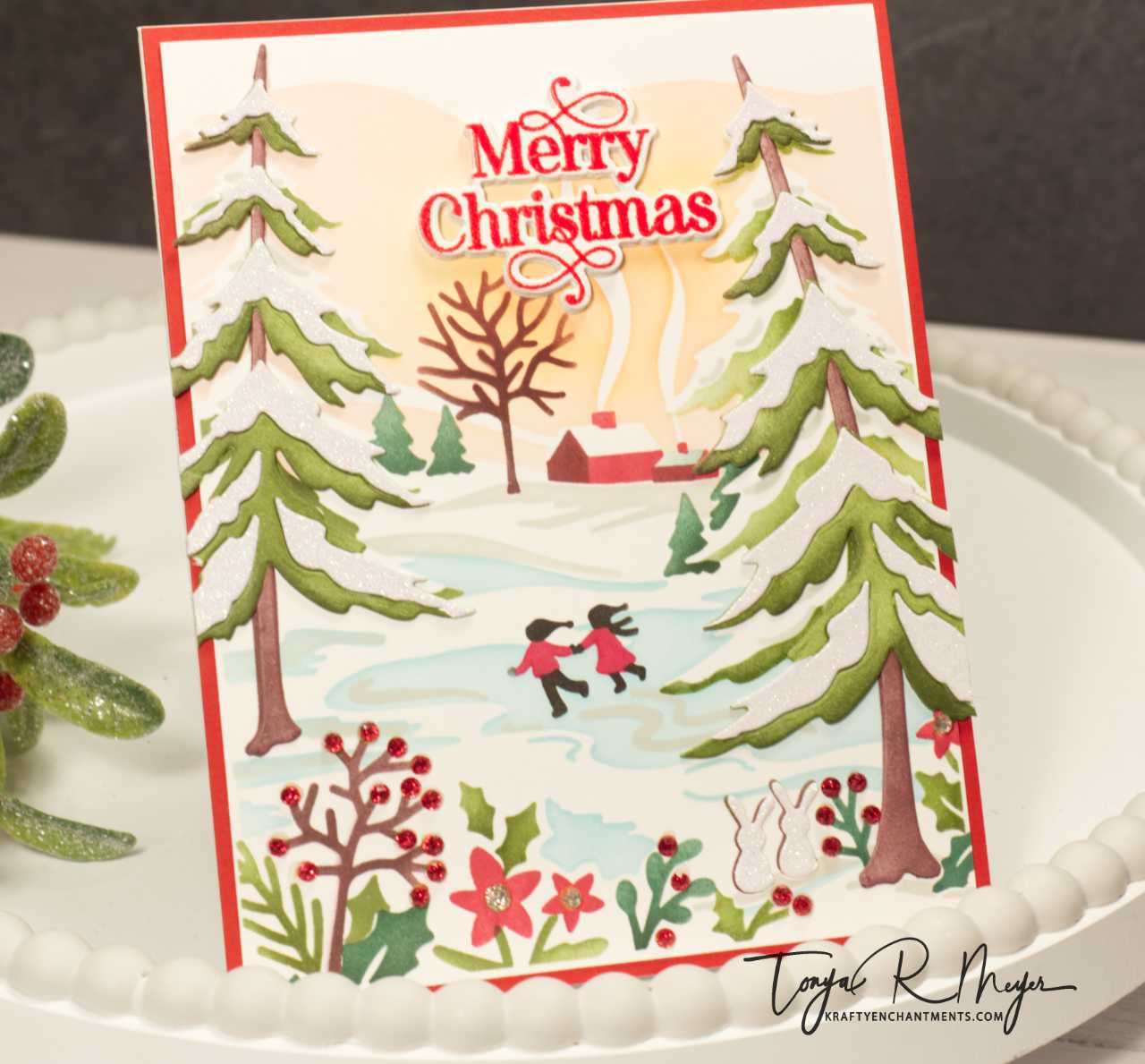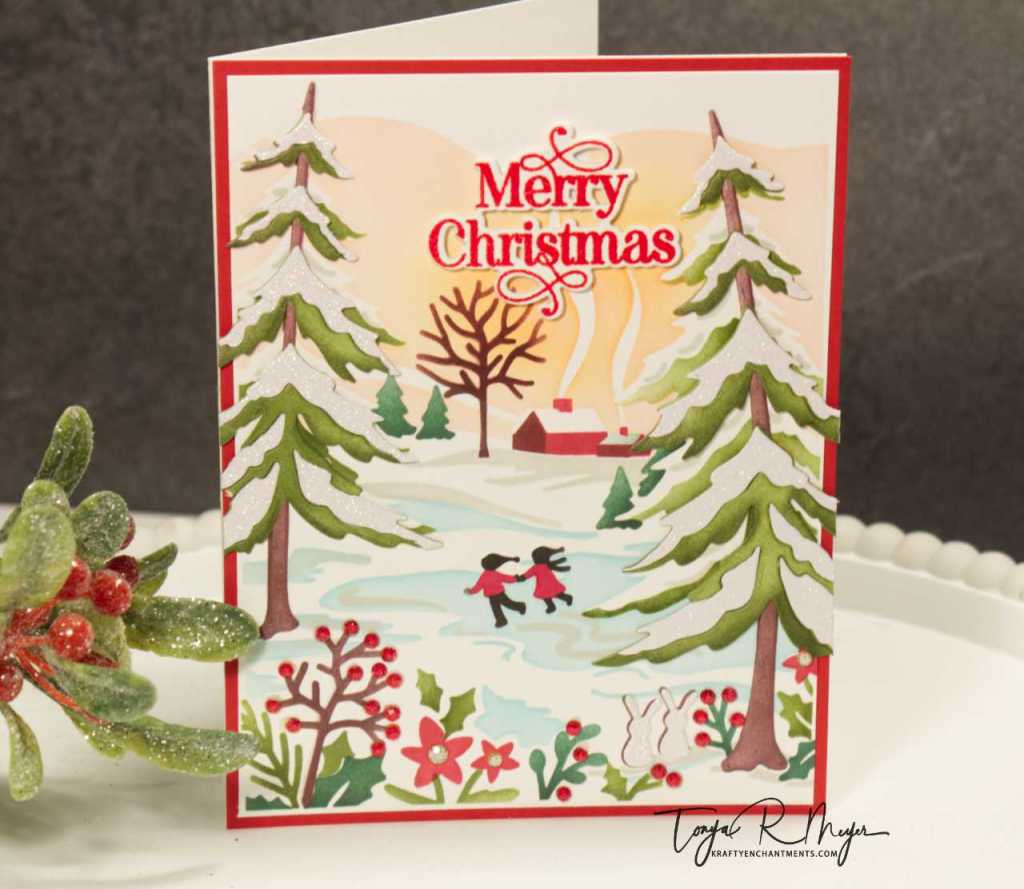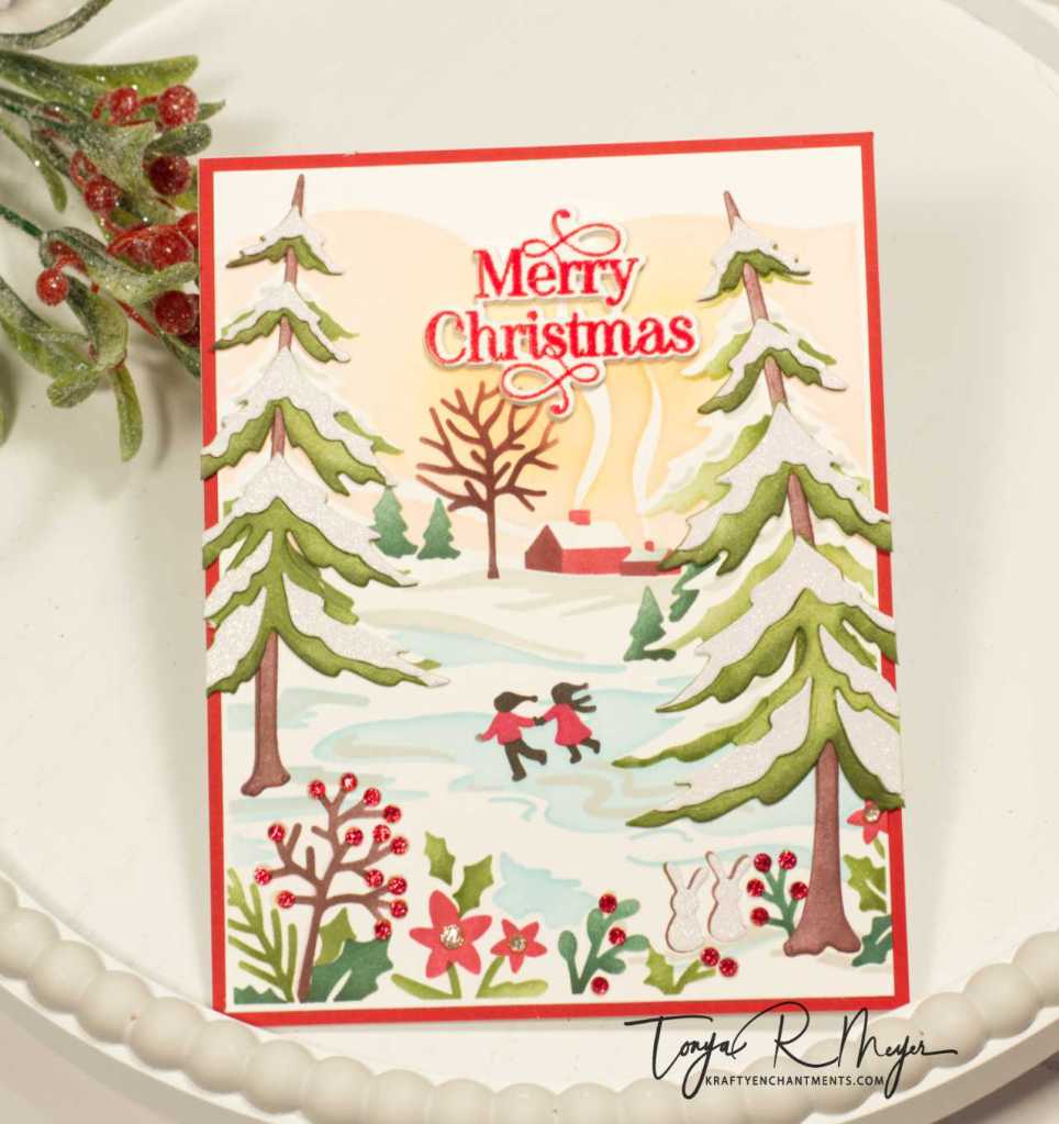 For my next card, I had to create a scene card with a layering stencil set from another one of my favorite companies, The Greetery. I love everything that The Greetery puts out but their Holiday Releases are always a favorite of mine. I love that they always think of every little detail for their releases. This year there were some great sets but the Stencil Scapes Winter Stencil set was my favorite from the Song of Christmas Release in October. It creates this fun winter scene from a 6 piece layering stencil set. I just love this cute little scene with the pond and the couple ice skating.