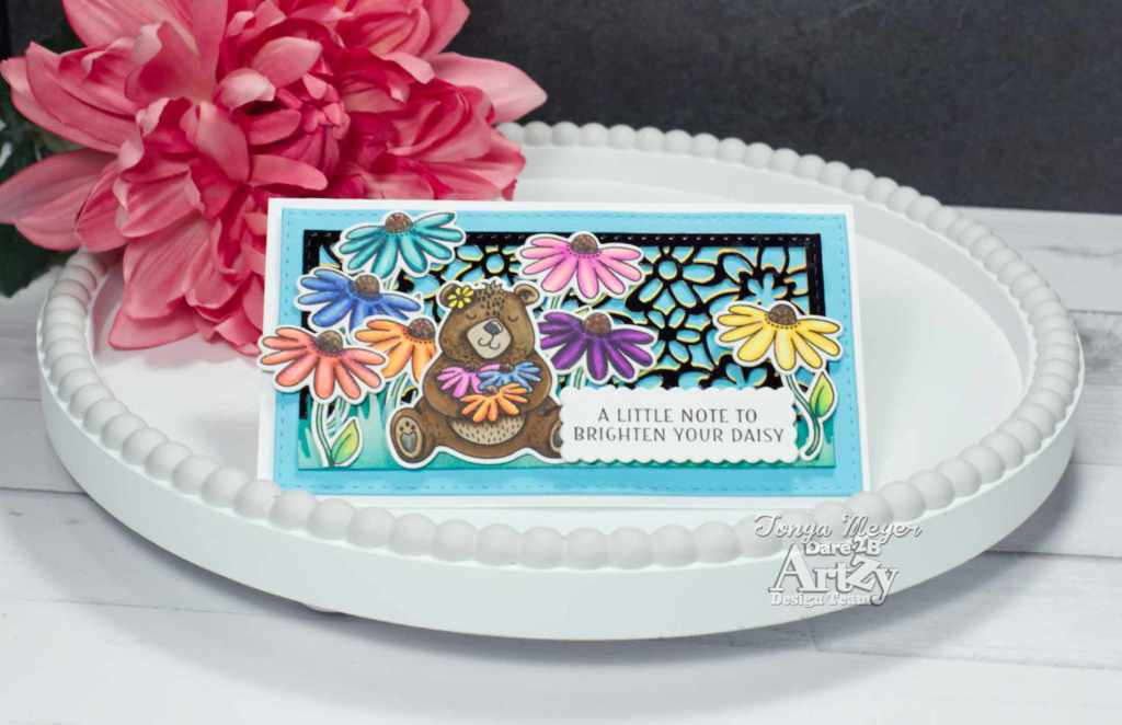 I added the cute little bear and two additional Daises to the front of the panel using some dimensional foam.