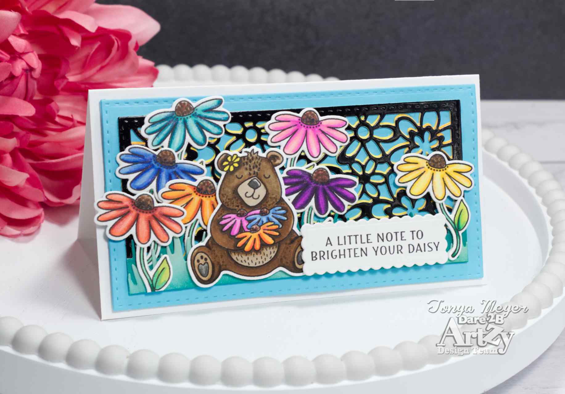 I added the cute little bear and two additional Daises to the front of the panel using some dimensional foam.