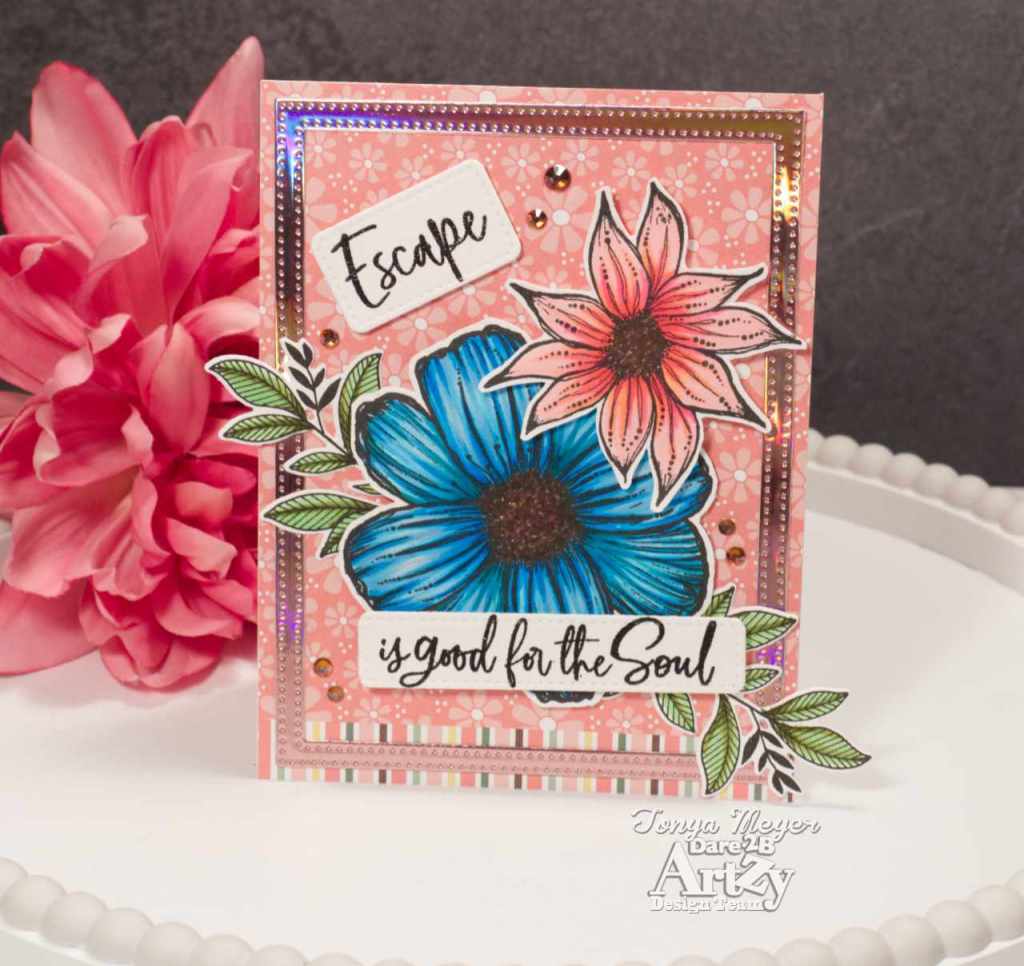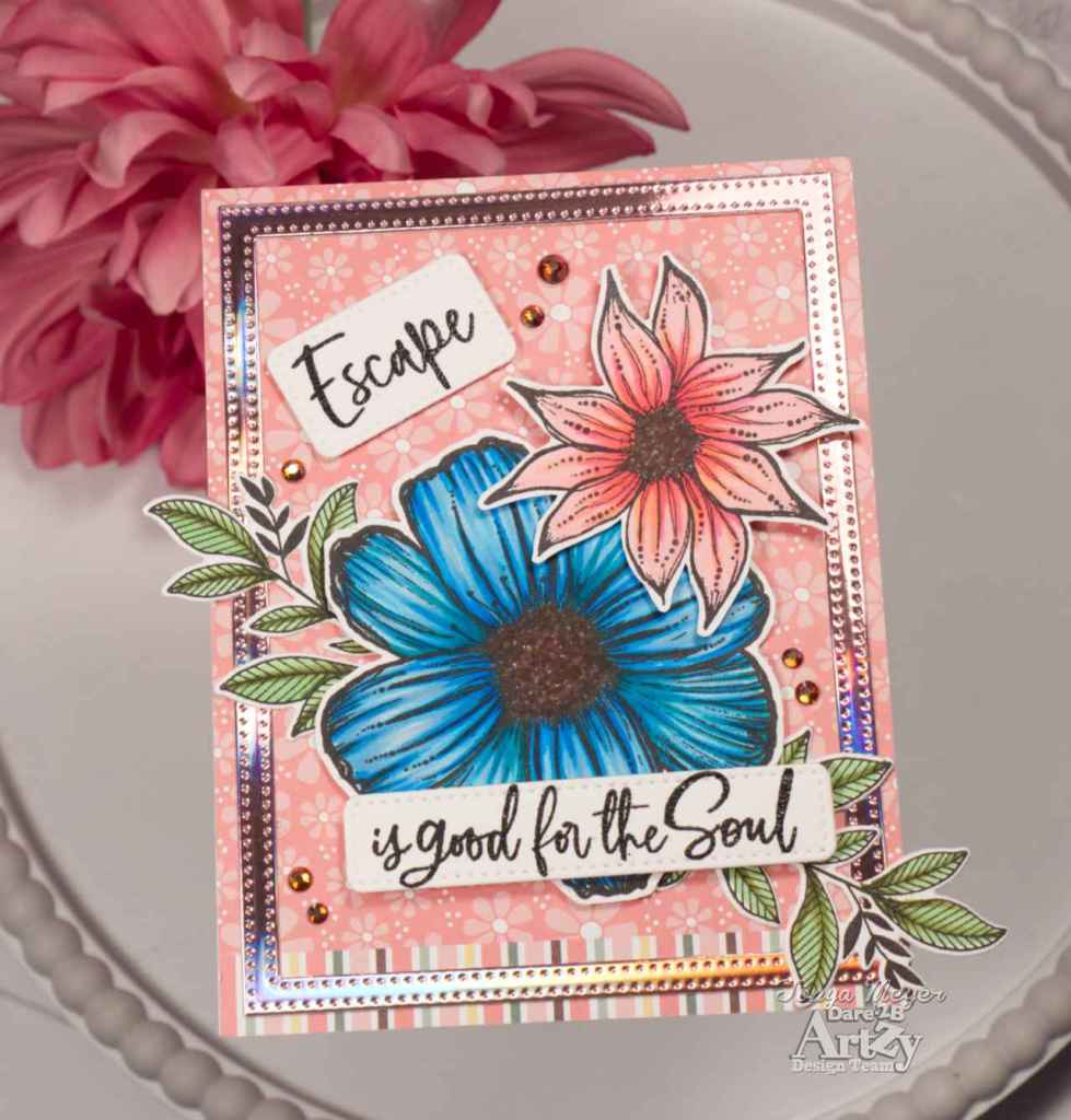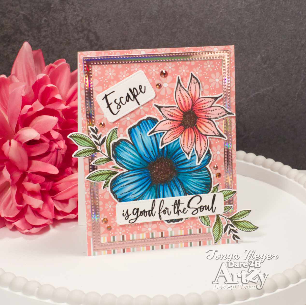 I am back today to share some new products from Dare 2B Artzy. My card today features some of the new flower stamps from the Totally Tracy line of stamps at Dare 2B Artzy. She just recently launched 3 new stamp sets and I am in love with these big, artzy blooms that are fantastic to color and use with mixed media.