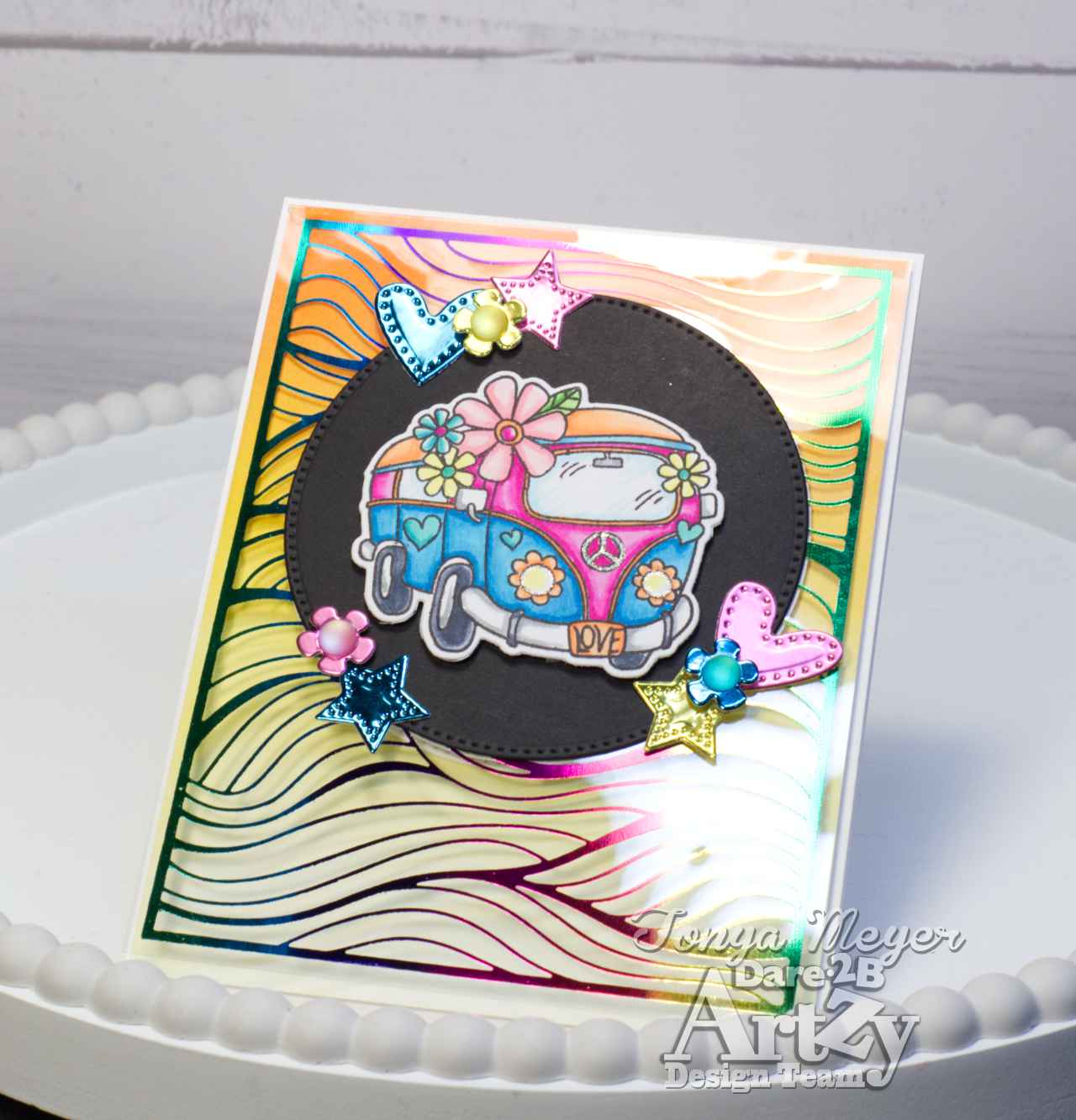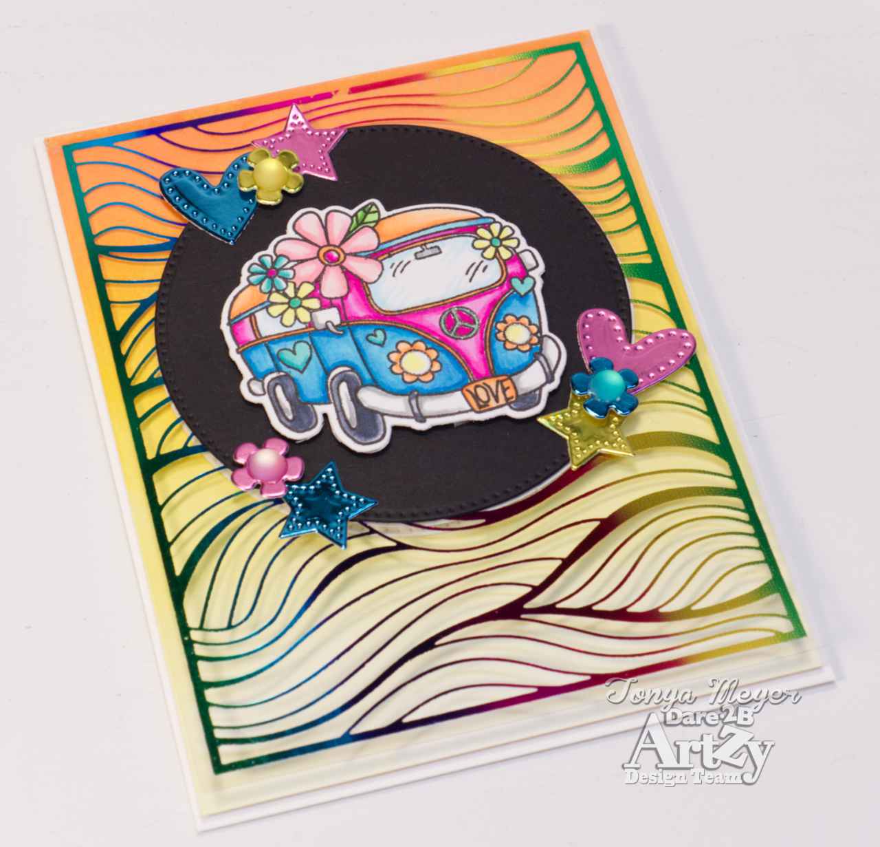 Using the Double Dot Circle Die, I cut 3 circles. Two from white cardstock and one from black cardstock. I added the Black cardstock circle to the front of the heat foiled acetate sheet with some double-sided tape. I added a bit of foam tape to the back of my die cut Groovy Van and placed it in the center of the die cut circle on the acetate.