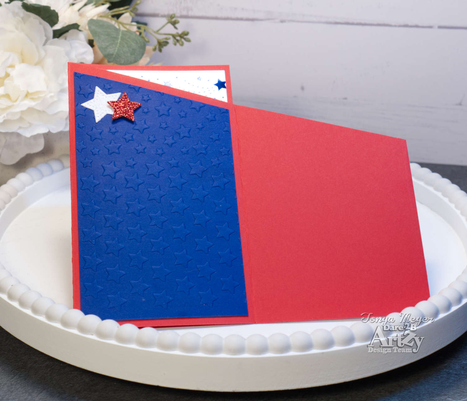 I cut the embossed panel down so that it would fit behind the front panel and have the nice embossed stars peeking out. The cut panel measured 3 ¼ x 5 ½ and then cut at an angle to match the card base with a 1/8-inch border as well.
