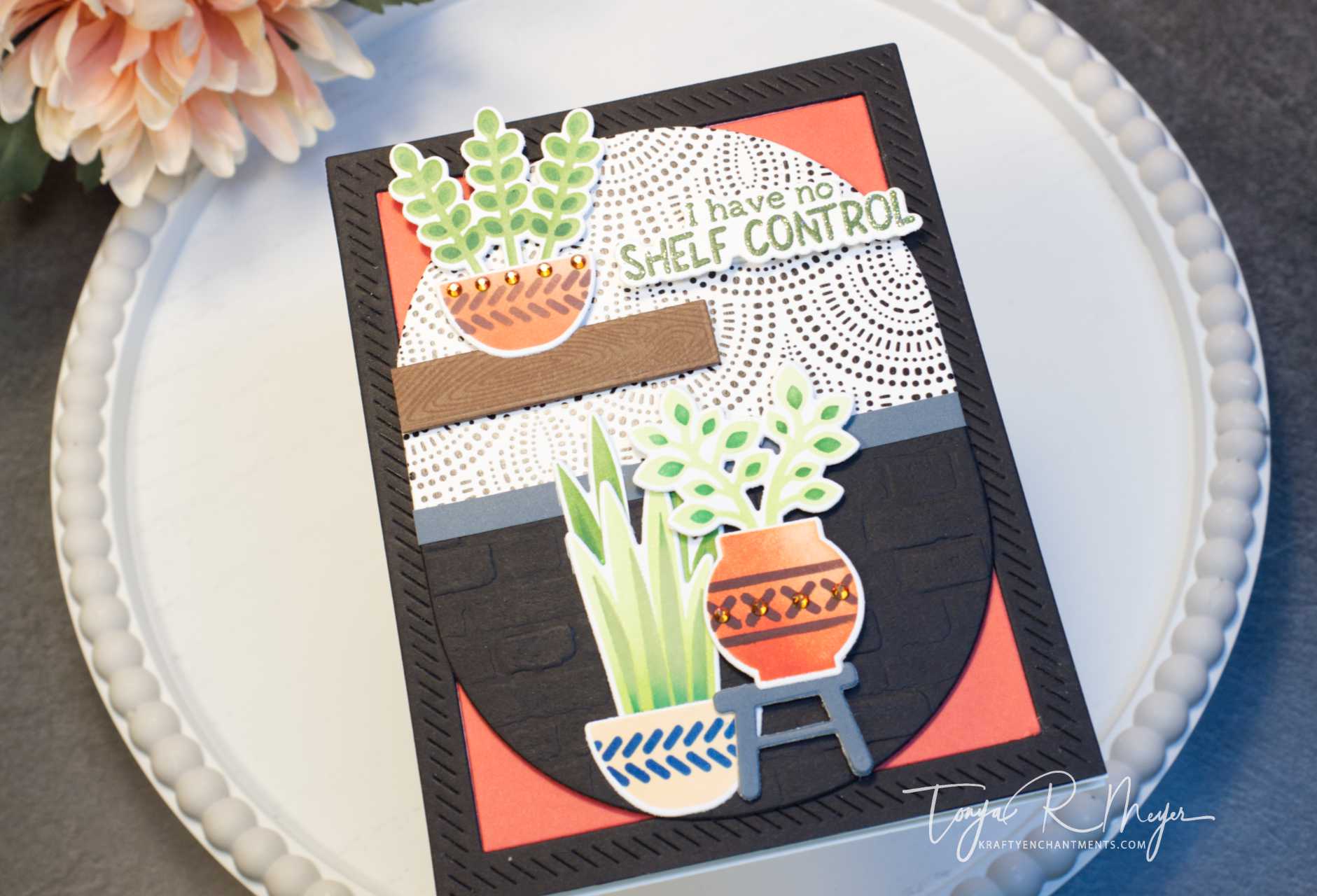 The card kit also comes with a great set of sentiment stamps called Shelf Control. There are 9 punny plant sentiments in the set. I stamped the I have no Shelf Control and heat embossed it with Taylored Expressions Cilantro Sparkle which was a limited release from Christmas.