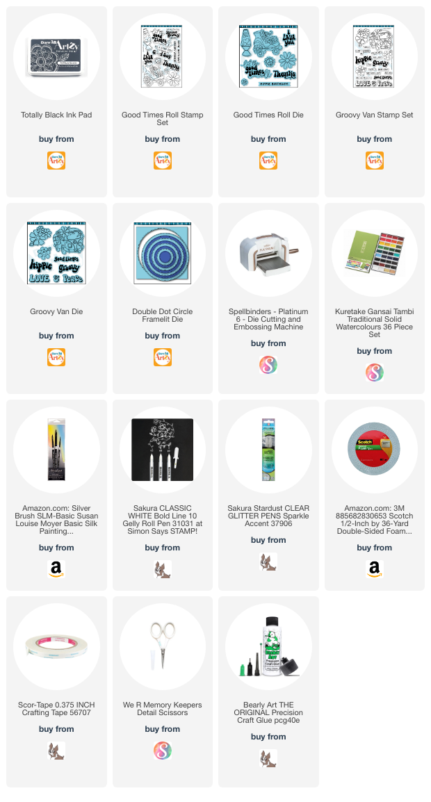 Thank you so much for stopping by! I hope you’ve enjoyed my tie-dyed card today featuring the Good Times Roll stamp sent and sentiments from the Groovy Van stamp and die set. I will link all of the products used in today’s card below for your convenience.