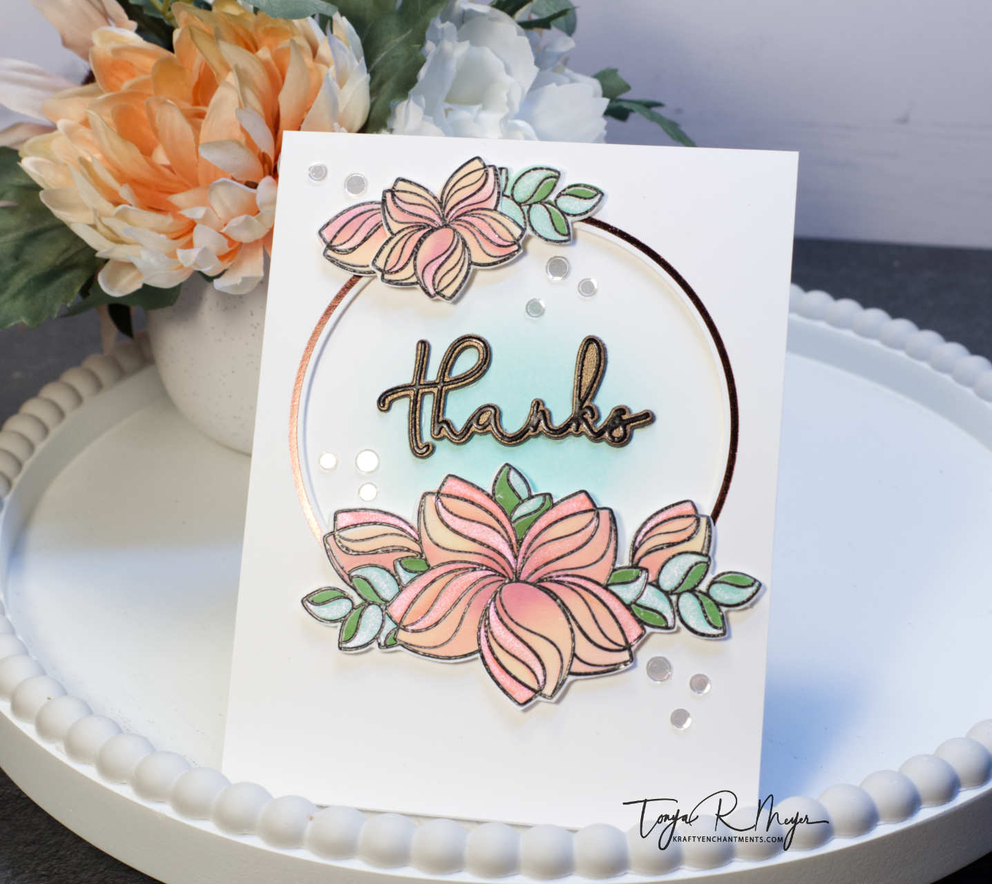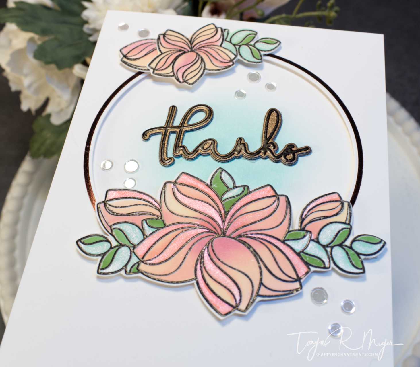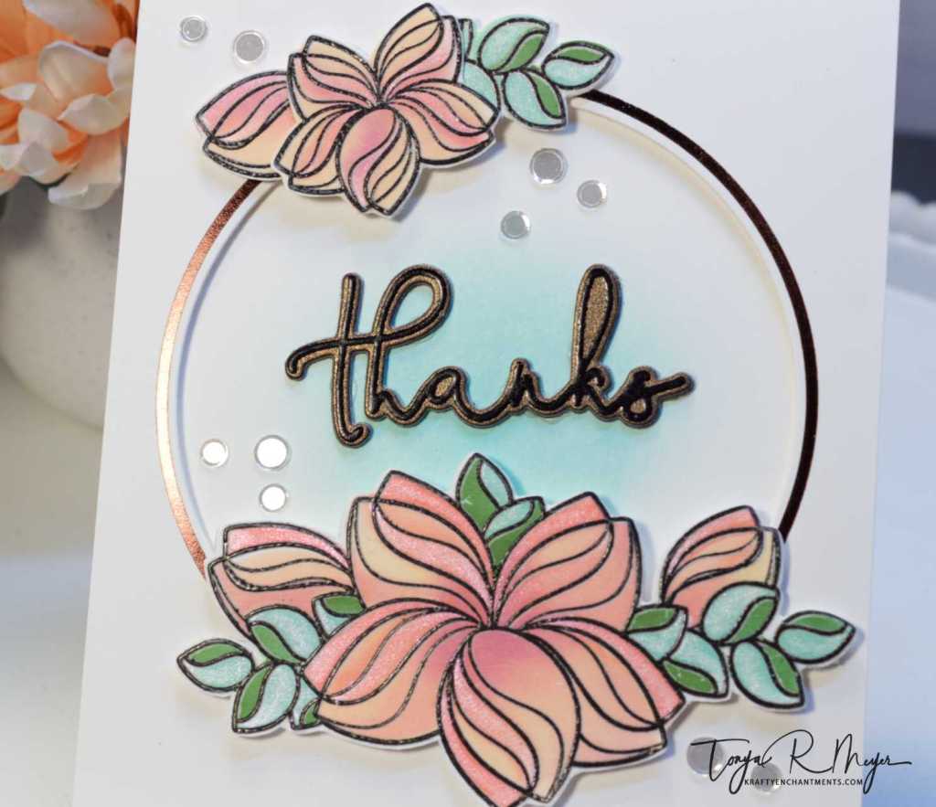 I added the foiled panel to the card base with a bit of dimensional foam. To pop up the flowers, I also added dimensional foam to them before placing them around the hot foiled circle on the front of my card panel.