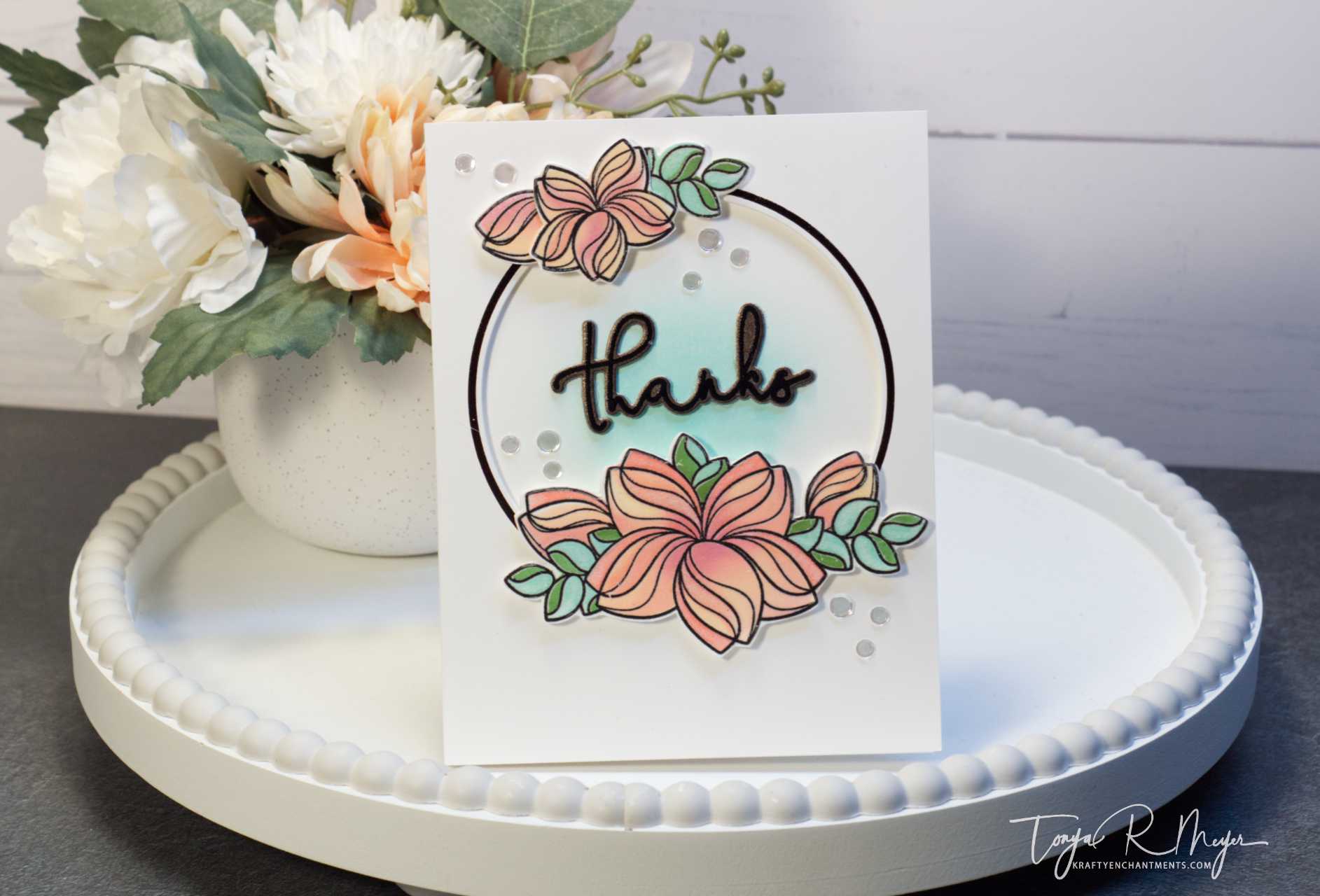 To add a bit of shimmer to the flowers and leaves, I used a Tonic Shimmer Pen which accentuates the Cheeky ink color I used on the flowers and seafoam on the leaves.