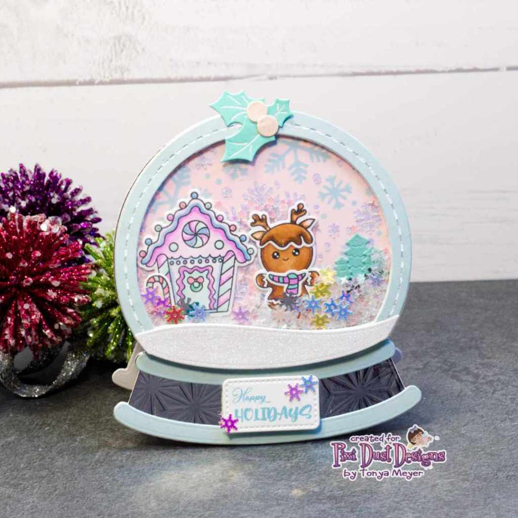 I am back today with a new card for Pixi Dust Designs. Today, I am playing with the brand new Gingy Dress Up Stamp and coordinating die set and I have paired that with the previously released Snow Globe die set to create a festive shaker card.