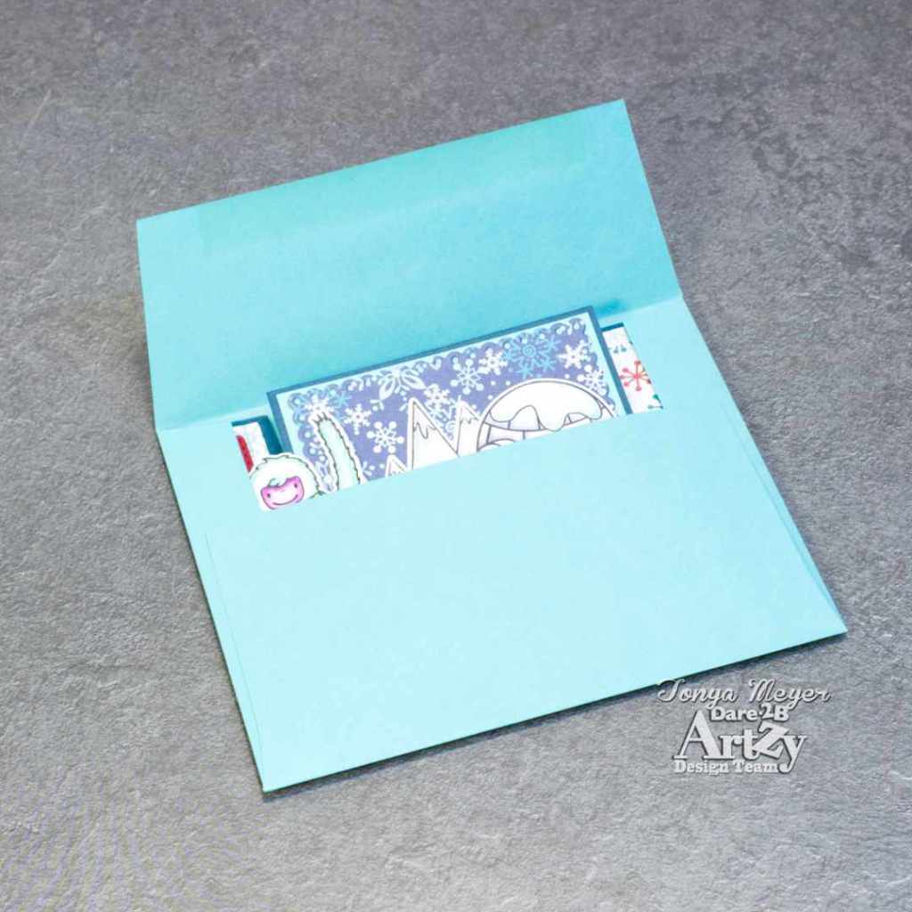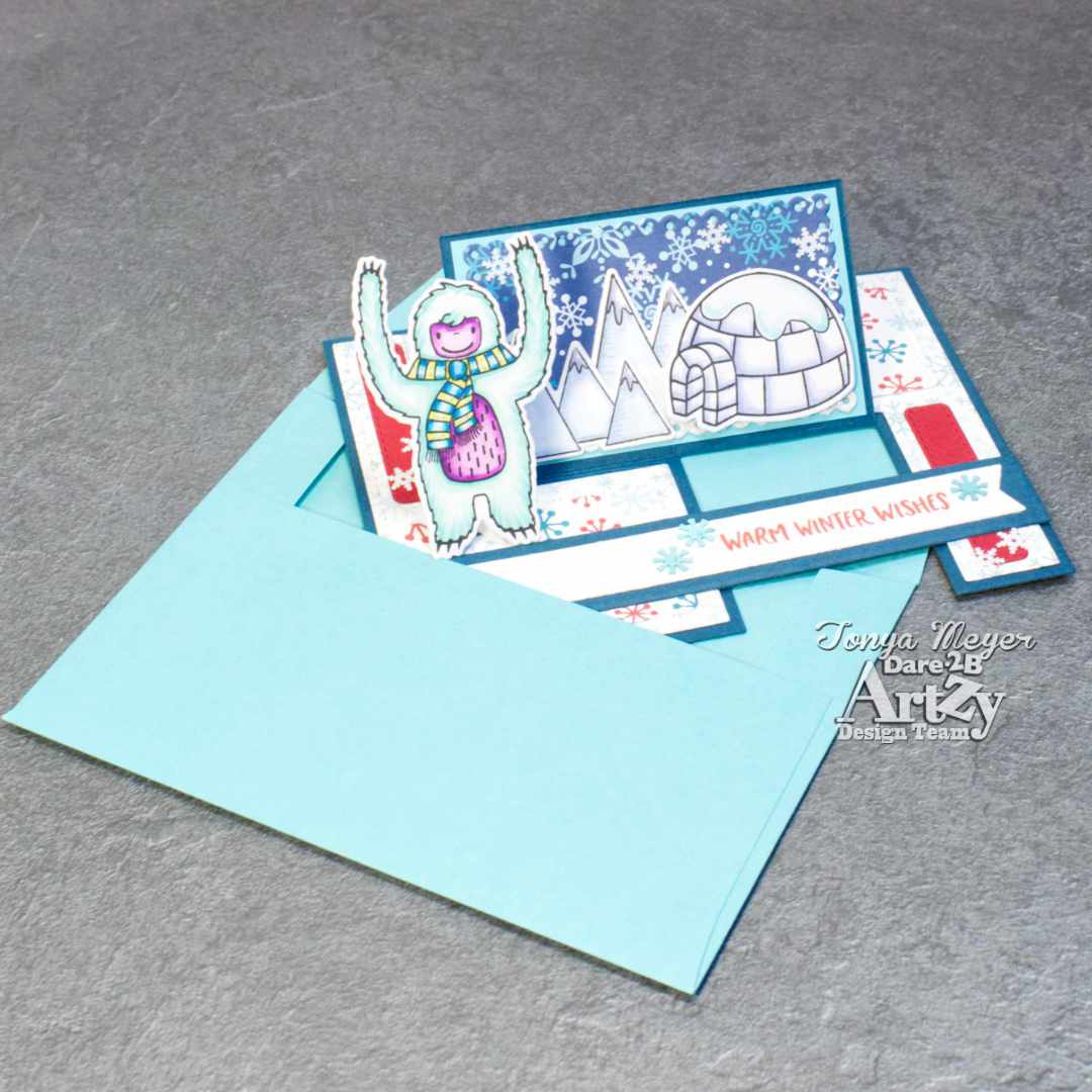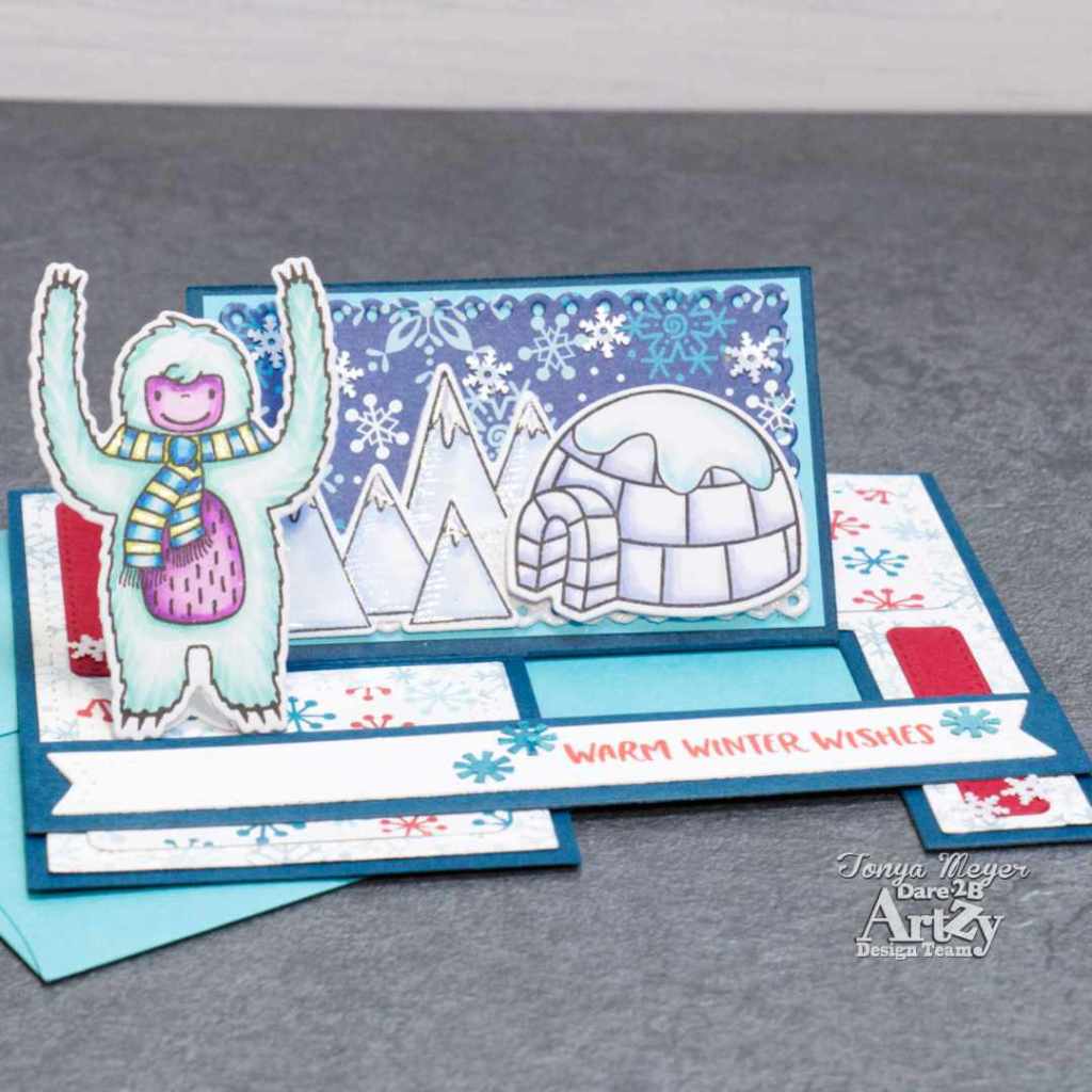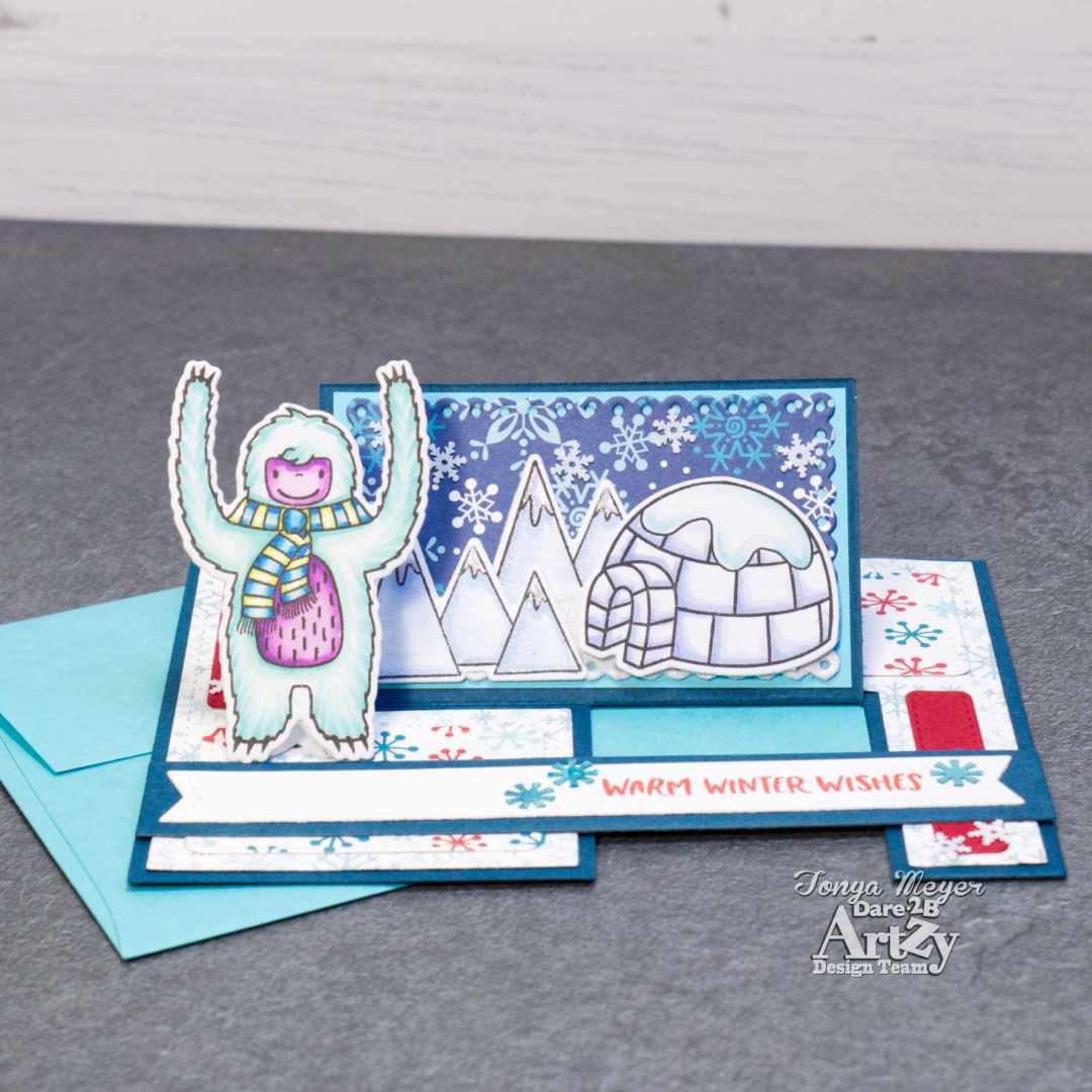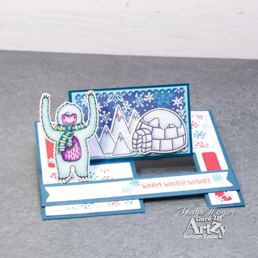 Next, I stamped and colored the images from an older Dare 2B Artzy set called Yeti 4 Winter and die cut them using the coordinating dies. I had fun coloring the Yeti image, he’s one of my favorites and yes, I gave him a purple face and tummy, LOL!