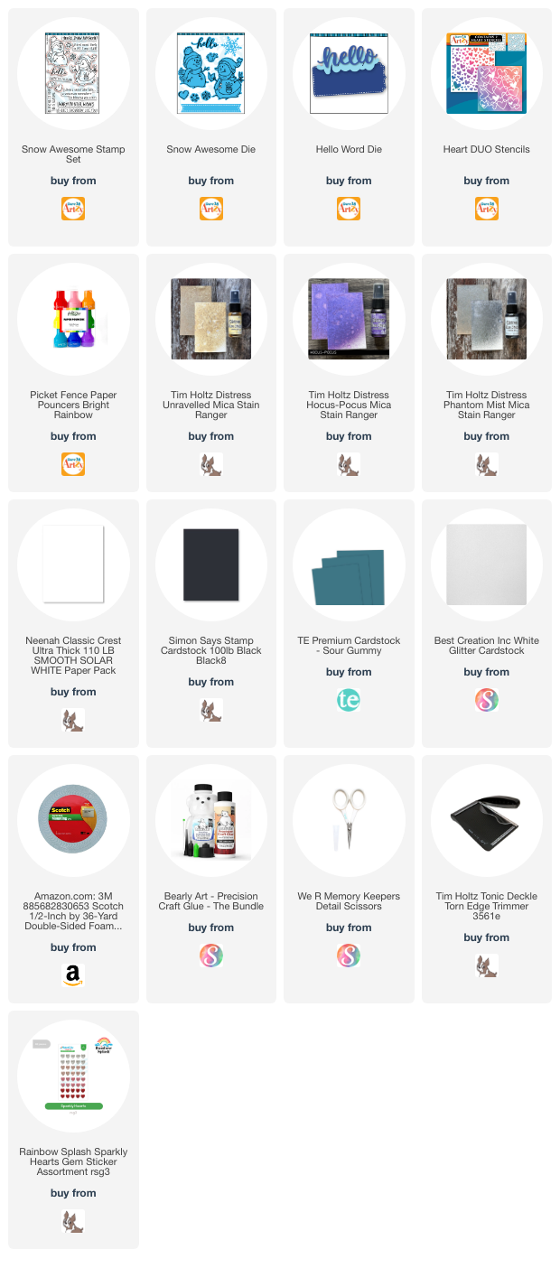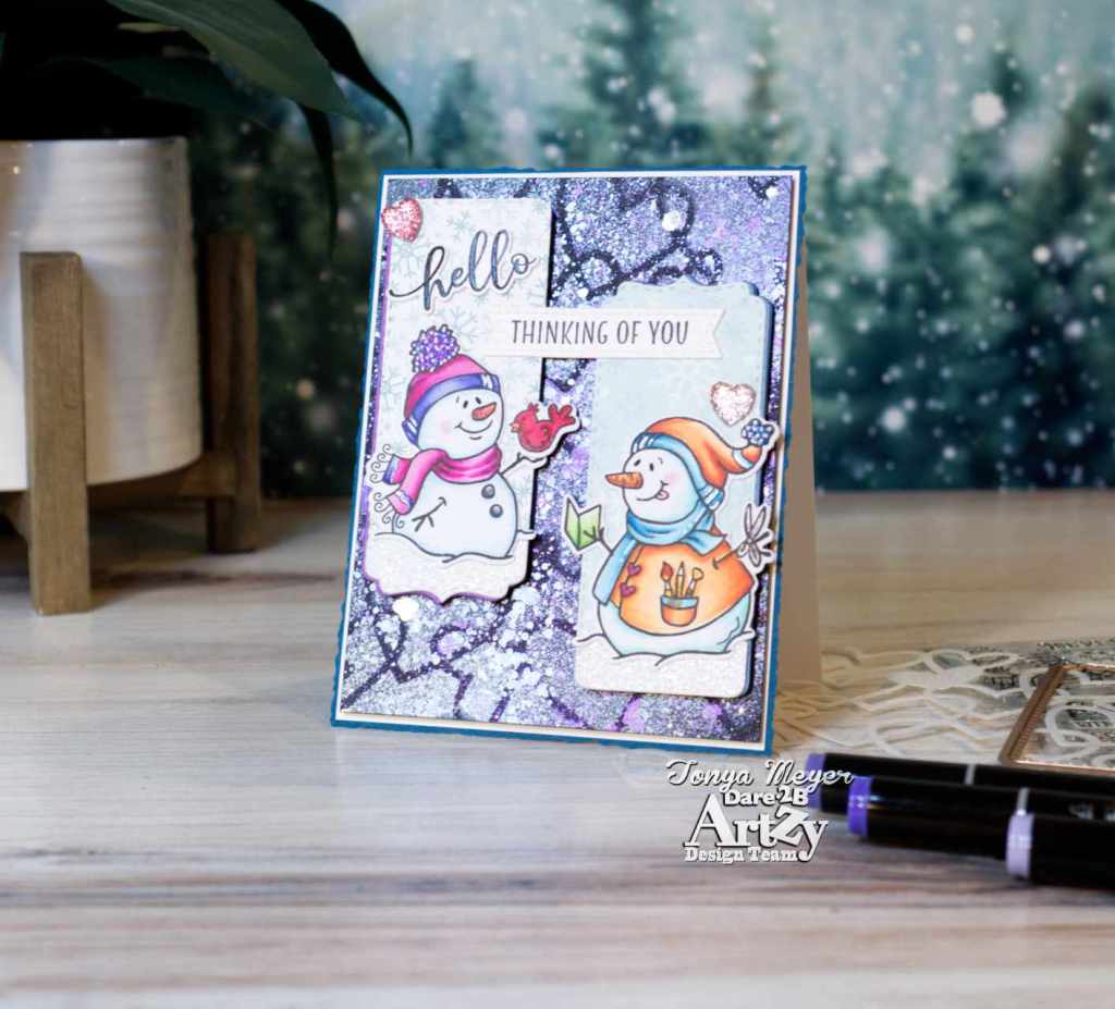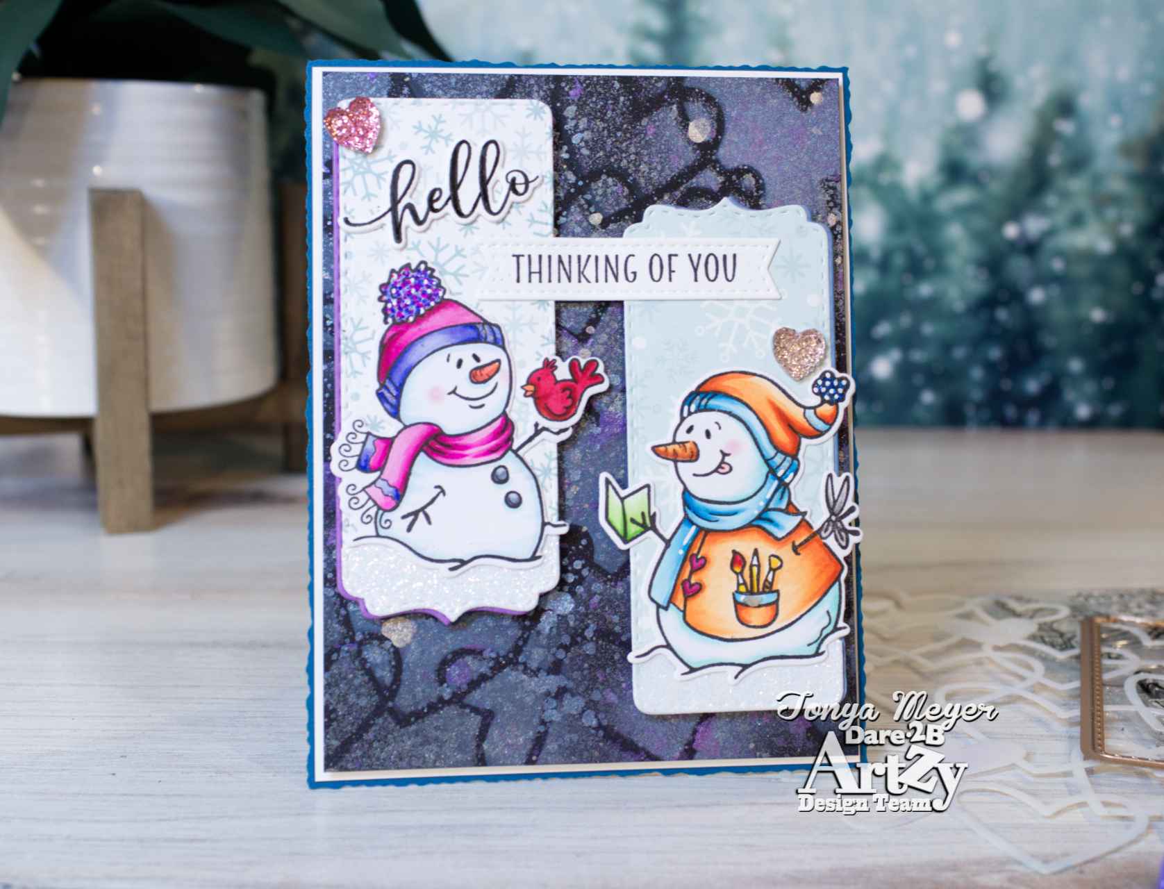 To start, I stamped and colored the adorable new snowmen and the little bird from the Snow Awesome stamp set. This was the Club Stamp set for the month of February which is now available in the Dare 2B Artzy store. The stamp has a lot of great sentiments and two adorable snowmen that can be used for all occasions.