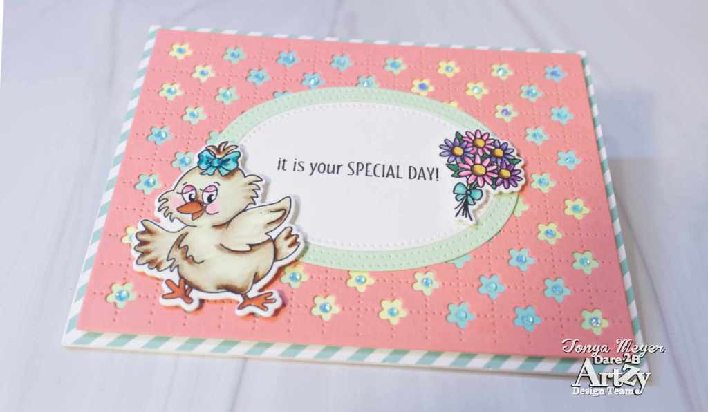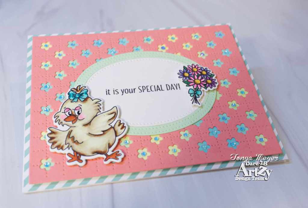 I have another fun card for Dare 2B Artzy today featuring this month’s Clubhouse stamp and die set for February called Spring Chicken.