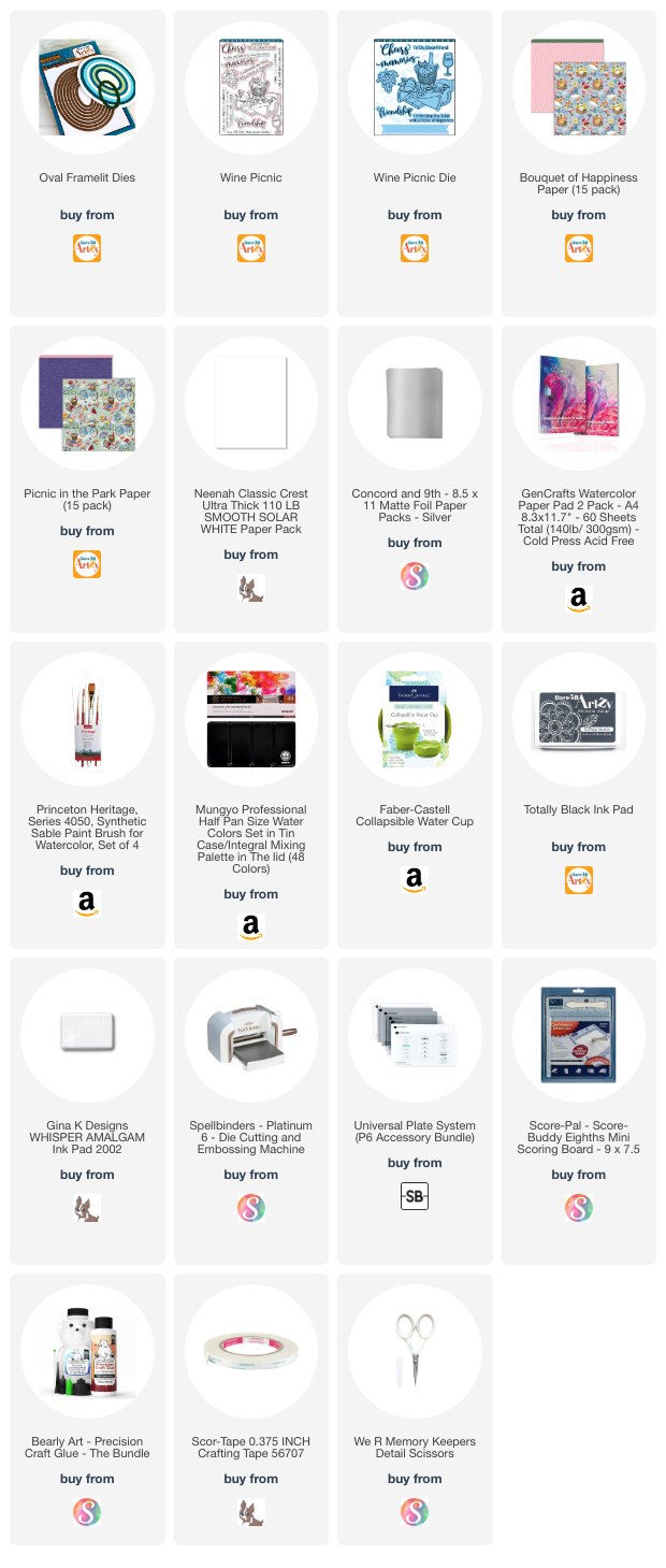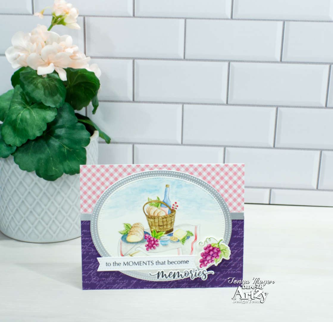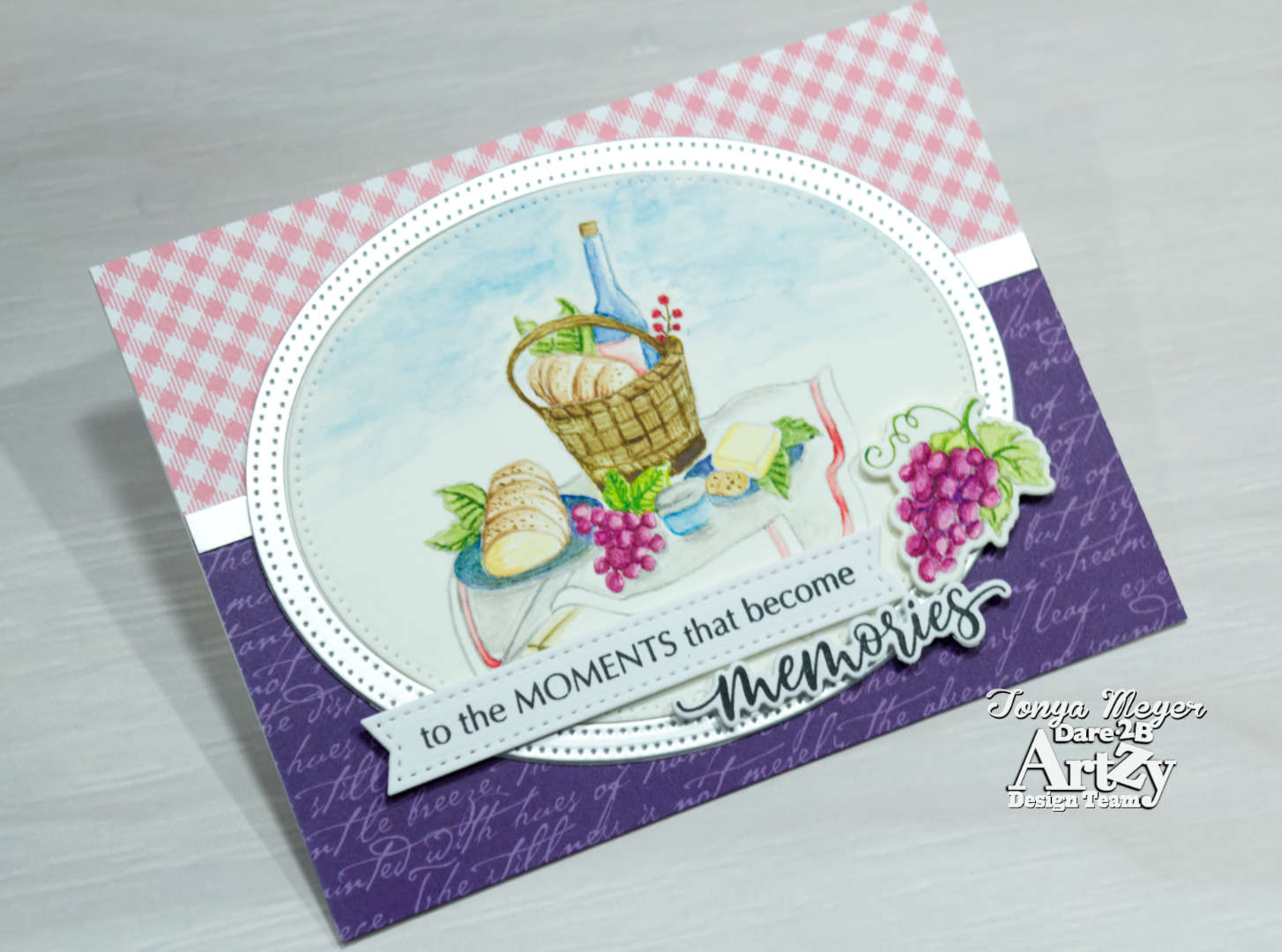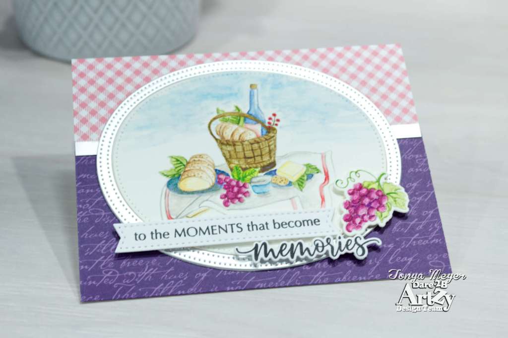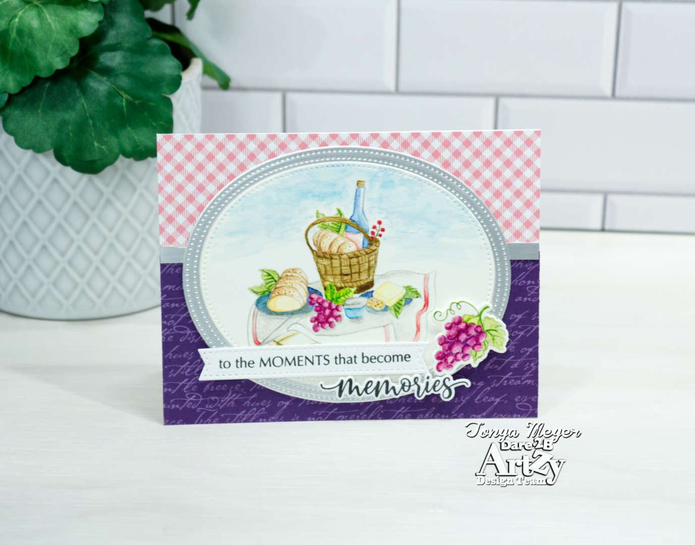 Today I am back with another card for Dare 2B Artzy. My card today features the Wine Picnic stamp and die set. This stamp features a wonderful picnic focal image with 9 sentiments and two smaller images including a wine glass and a cluster of grapes. There is also a coordinating die set that cuts out the images and many of the sentiments so it makes it a great value.