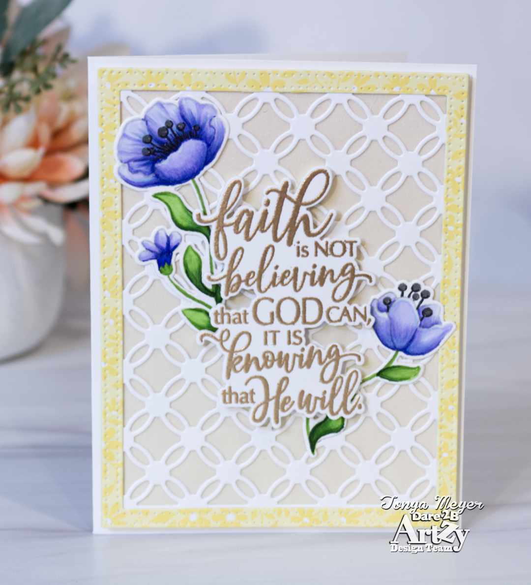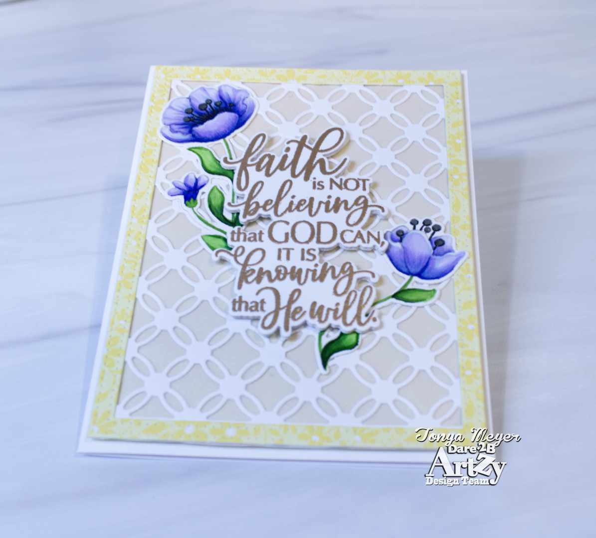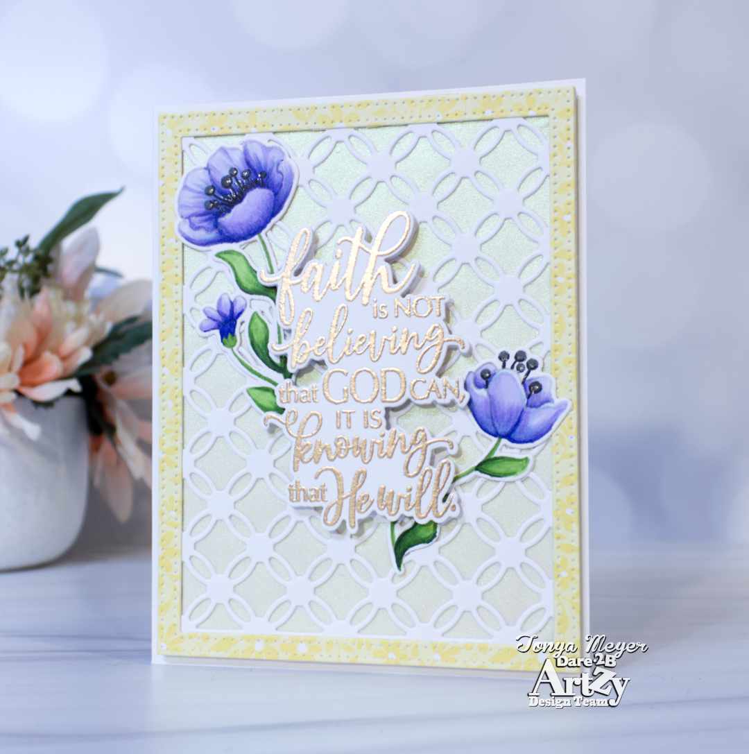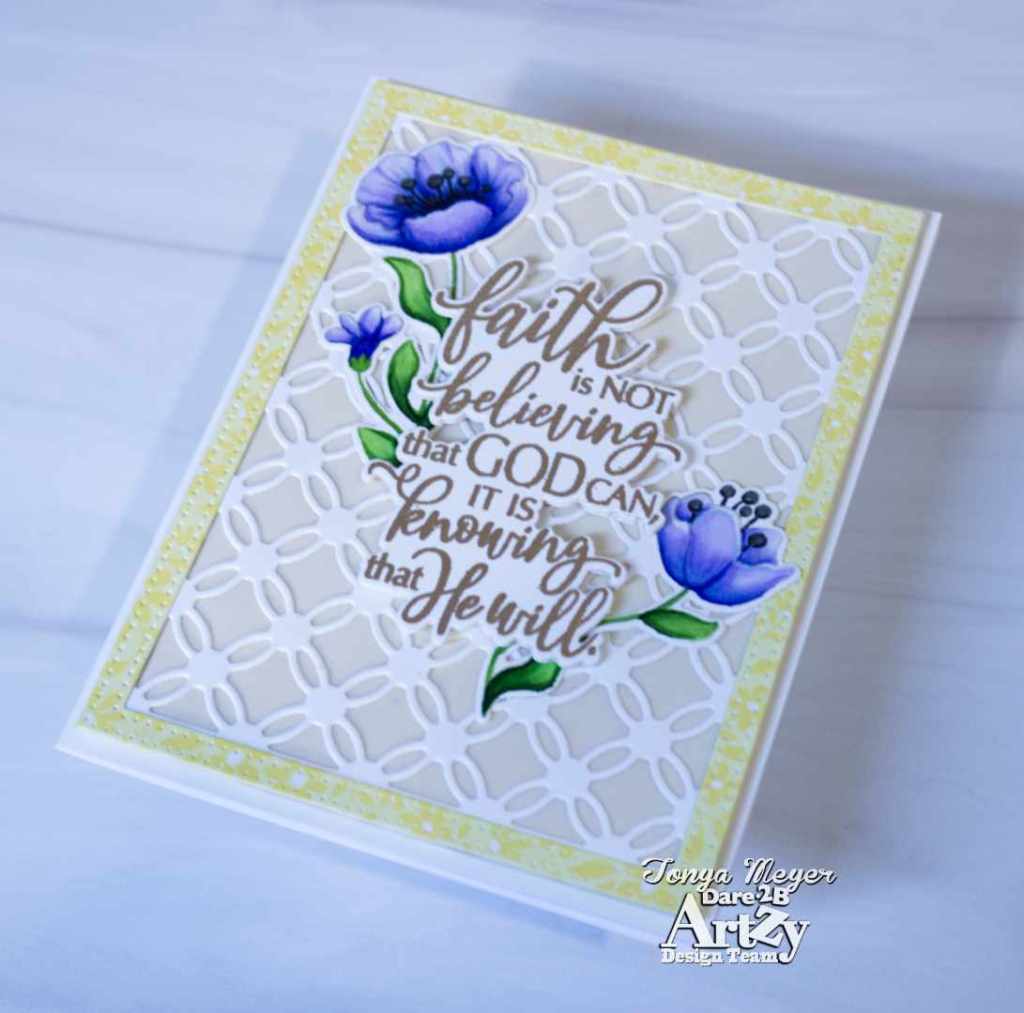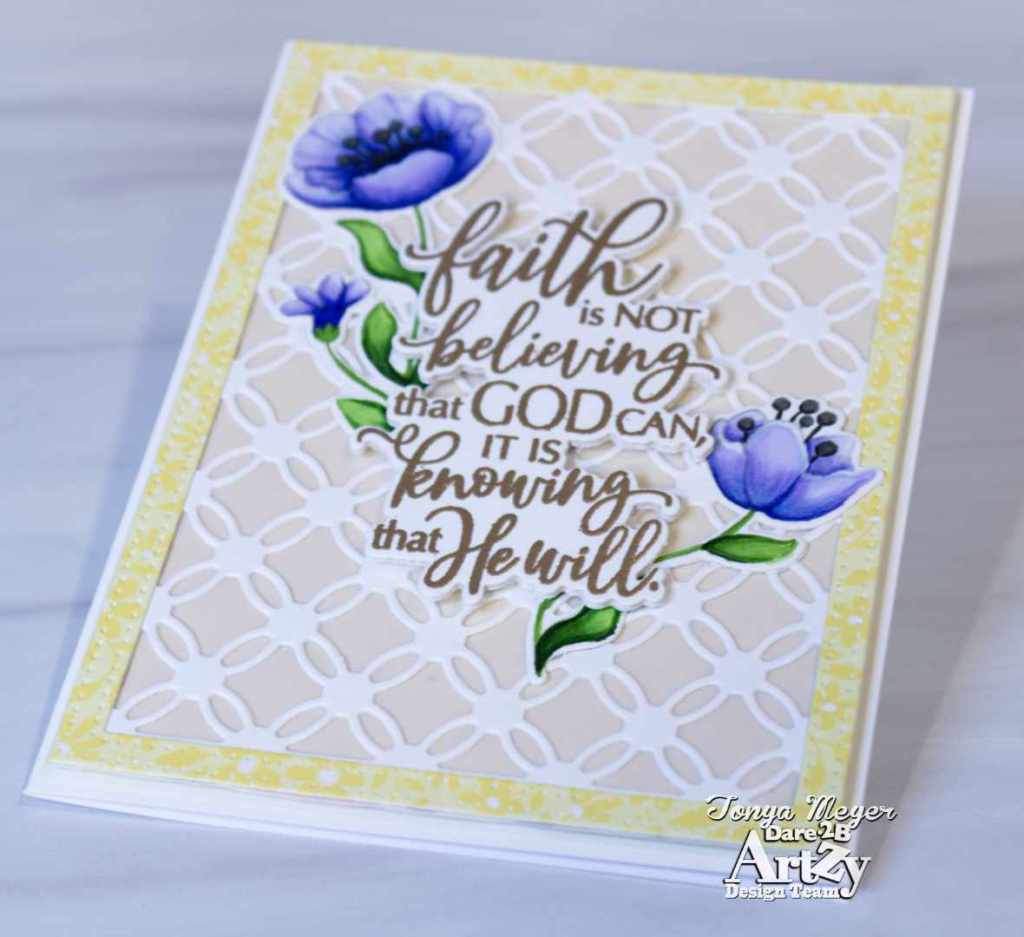 Today I have a new card featuring the new Faith stamp and die set from Dare 2B Artzy. This stamp has several messages of faith that are perfect for sending heartfelt messages to cheer and inspire anyone. The stamp set features 9 sentiments and two images. The coordinating die set has dies to cut everything out which is always a plus in my book.