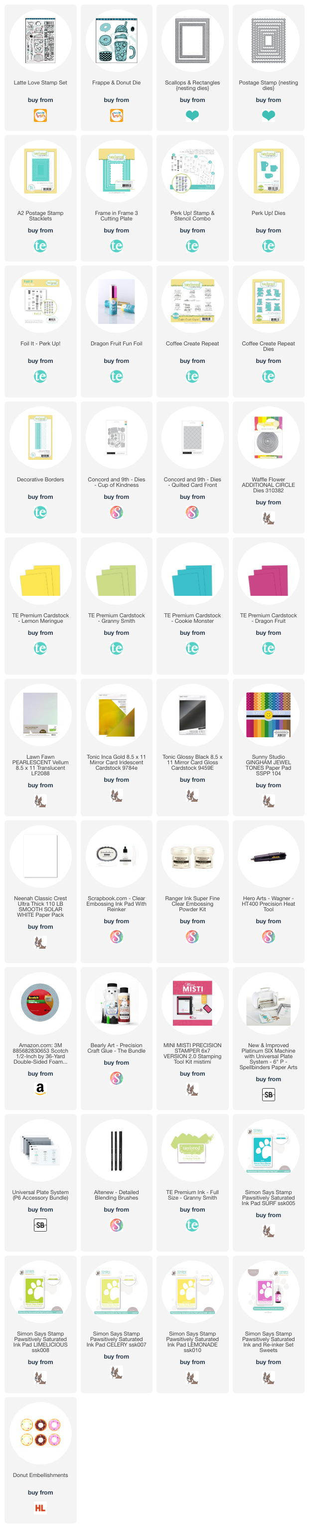 For my first card, I used items from the Taylored Expressions Perk Up collection, starting with the Perk Up Foil-It’s and Dragon Fruit Fun Foil. Using the coordinating Perk Up Layering Stencil from Taylored Expressions, I ink blended on several Simon Says Stamp’s inks; Surf, Sweets, Lemonade, Celery and Limelicious. I always feel like the coordinating products make it easy to pull a card together. The Coffee Create Repeat sentiments are so fun and the sentiment I chose is right up my ally. I did use the dies that coordinate with the stencil to cut out a little coffee cup to place next to my sentiment.
