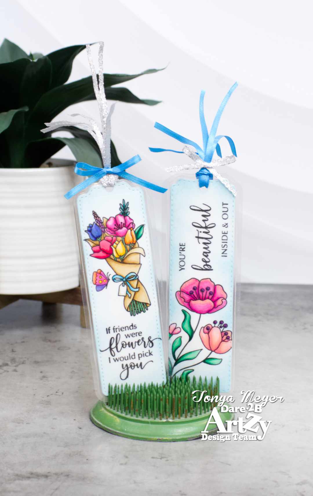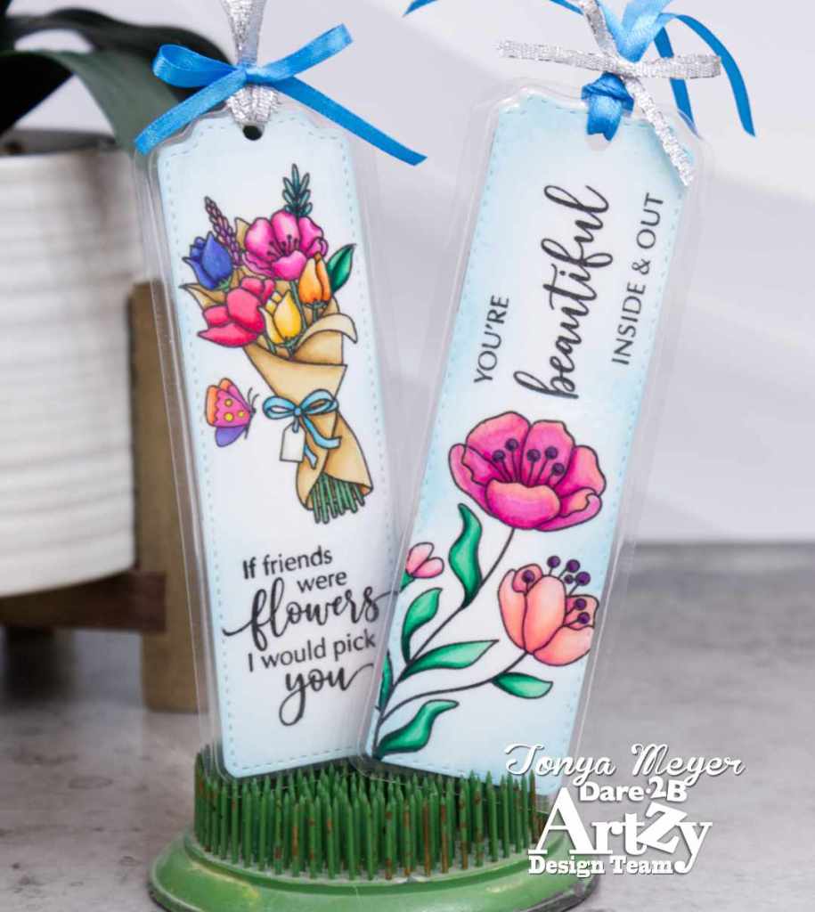 Once you have your bookmark, it’s time to decorate it. There are so many wonderful Dare 2B Artzy stamps that you can use to decorate your bookmarks. I chose to use the largest flower from the Beautiful Inside stamp set along with the sentiment You’re Beautiful Inside and Out and the paper wrapped flower bouquet from the Bouquet of Happiness stamp set along with the sentiment, If Friends were Flowers, I would Pick You.