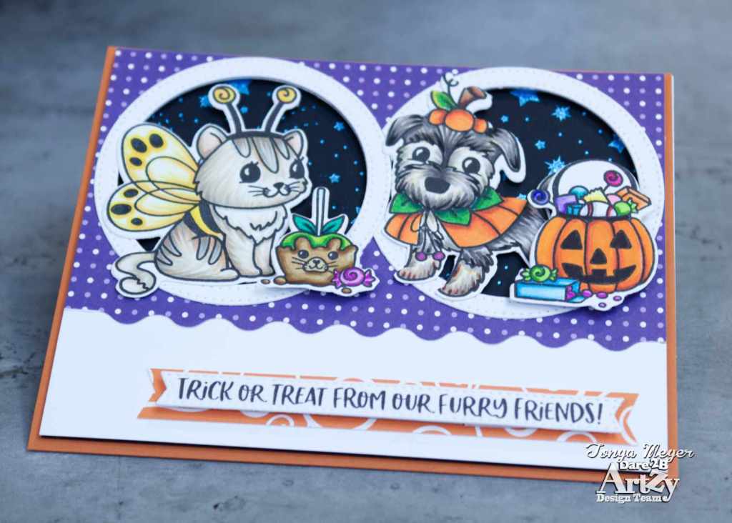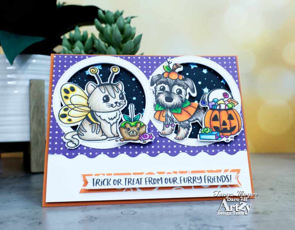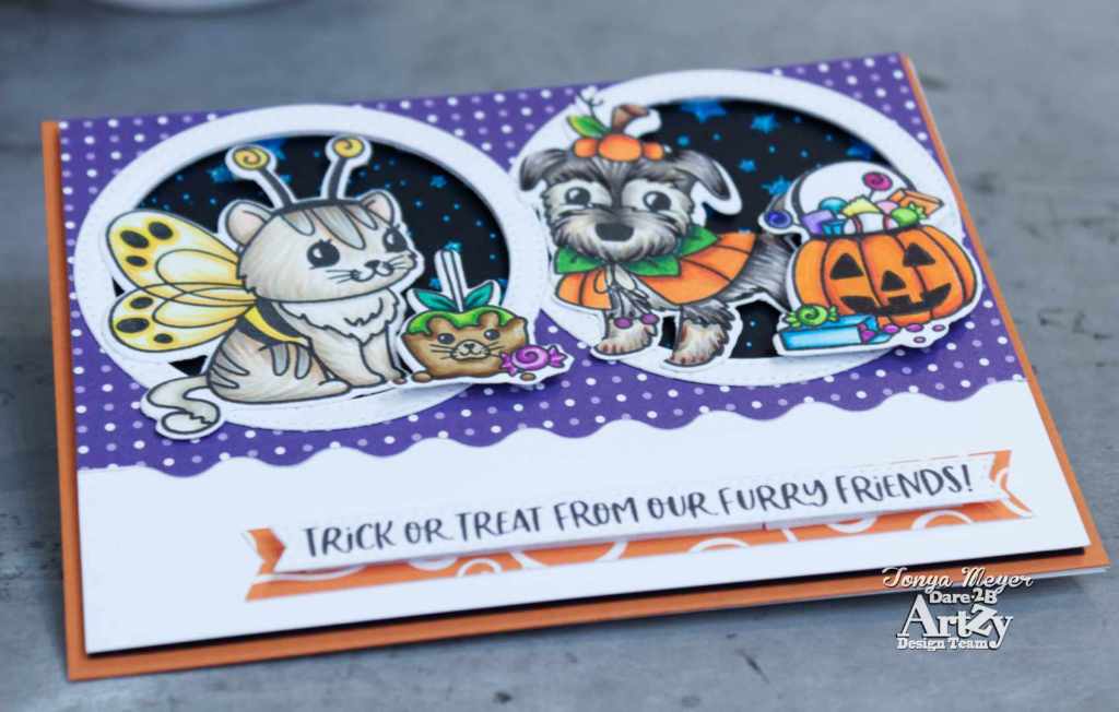 For the sentiment, I stamped the Trick or Treat from our Furry Friends with Dare 2B Artzy Totally Black ink and die cut it using the flag die that comes with the die set. I layered that onto some older (retired) Dare 2B Artzy cardstock. A good alternative to use might be the Orange Plaid paper or the purple Artzy Doodles paper.