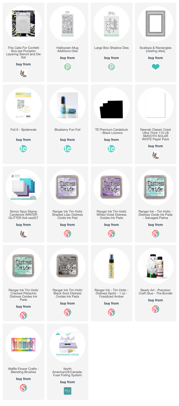 My background panel was created from the Taylored Expressions Spider Web Foil it Panel. I used some Blueberry foil on the Spiderweb panel and ran it through my Fuse on a setting of 3. When finished, I ink blended on some Wilted Violet, Cracked Pistacio and Black Soot around the outer edges.