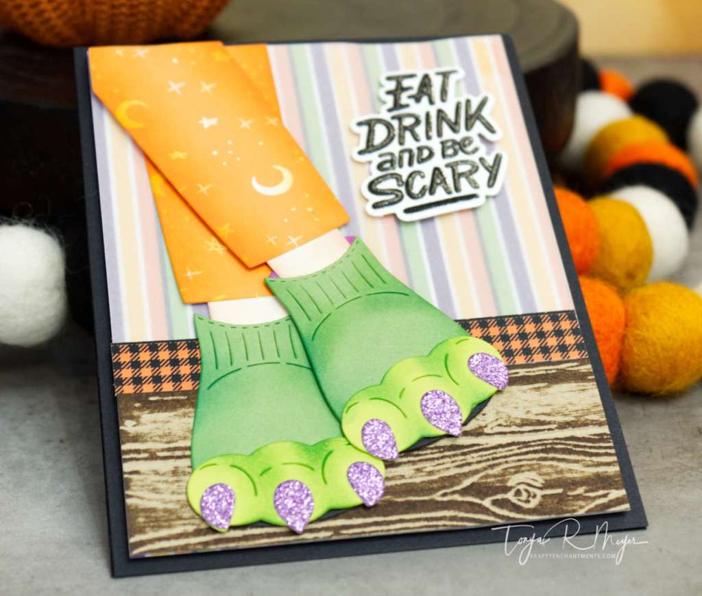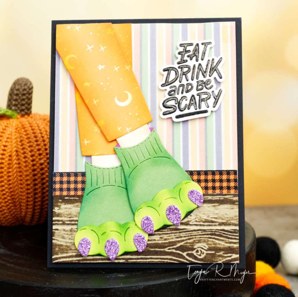 Today I have another Halloween card to share. This one features the Spellbinders October Large Die of the Month called Cozy Toes. I have seen so many adorable Christmas cards and gift tags made with this set but I decided I would take take it in a spooky direction for Halloween.
