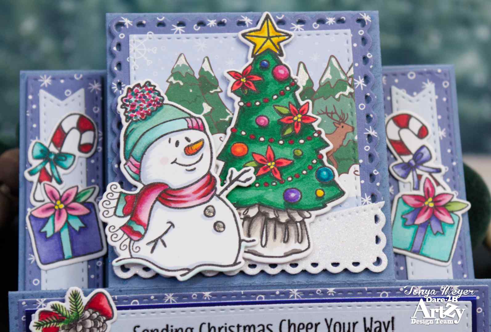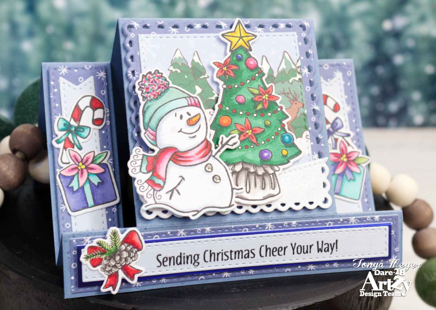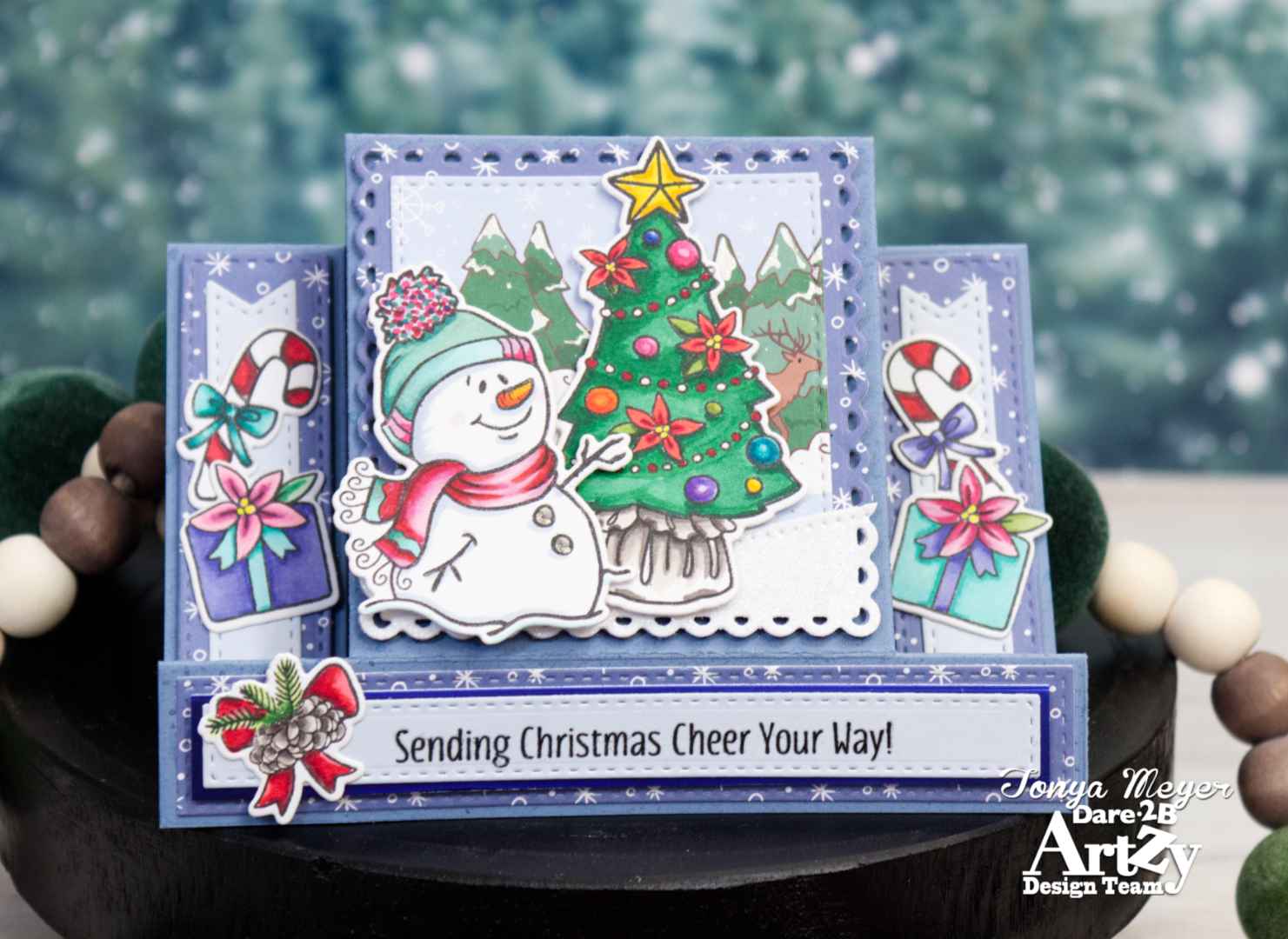 On my top layer of light blue cardstock, I stamped the sentiment Sending Christmas Cheer your Way with Dare 2B Artzy’s Totally Black ink and heat embossed it with clear embossing powder.