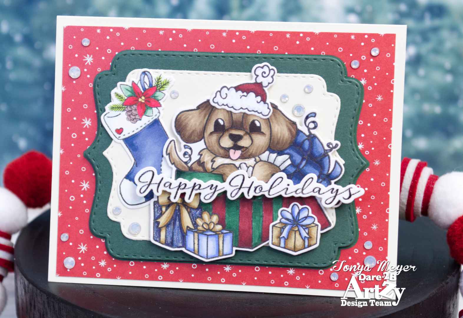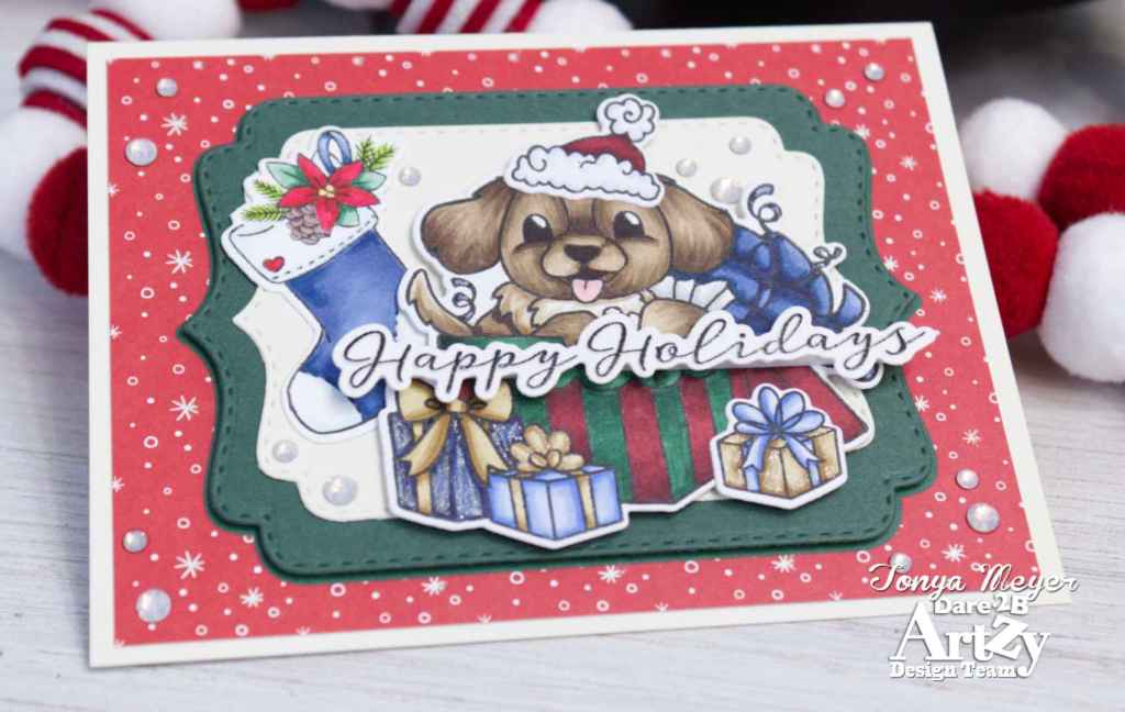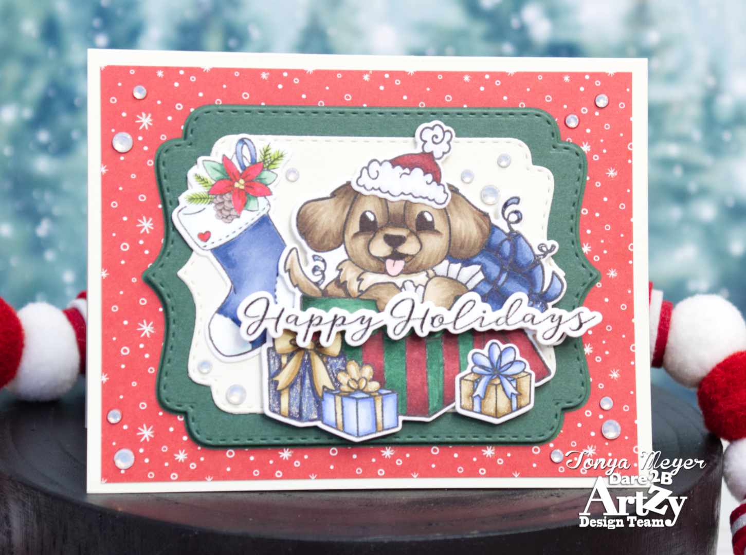 I have another Christmas Card for you today featuring Dare 2B Artzy products. This card features the adorable Puppy Present stamp set. There is also a coordinating die for this stamp set as well. This stamp is just too cute and very versatile as it can be used for either Christmas or for a birthday card. It has the main focal image with the puppy in the present. There are several other images that can be used to add a hat to the puppy or additional packages along with some confetti and ribbons. There are also nine sentiments in this set.