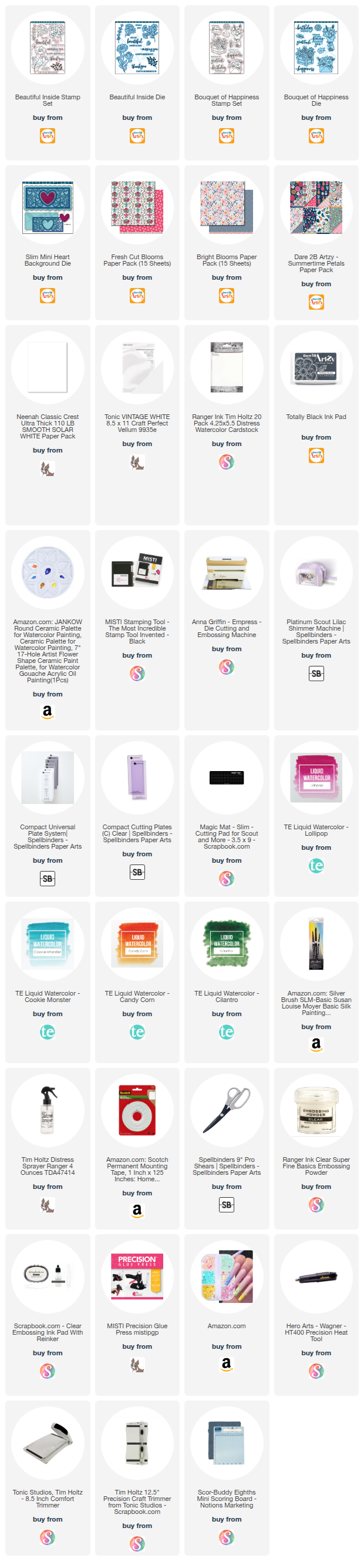 I am back today with a springy birthday card. It features flowers from the Beautiful Inside stamp set, the sentiment is from the Bouquet of Happiness stamp set. I also used some partial die cutting with the scalloped background from the Slim Mini Heart Background Die set.