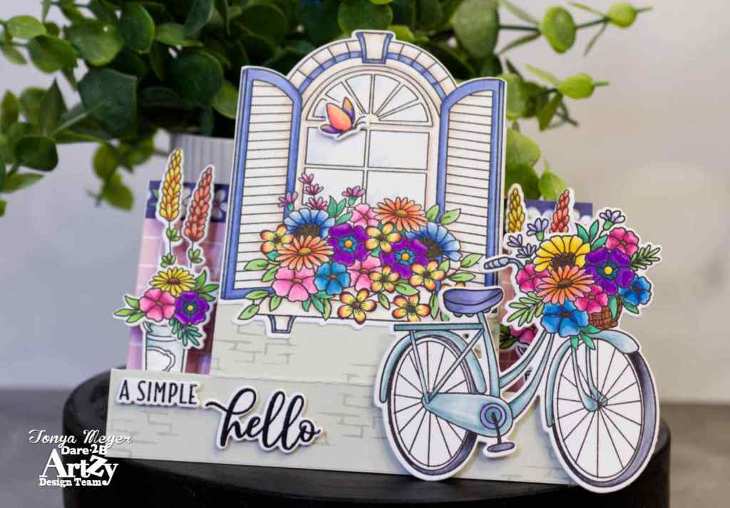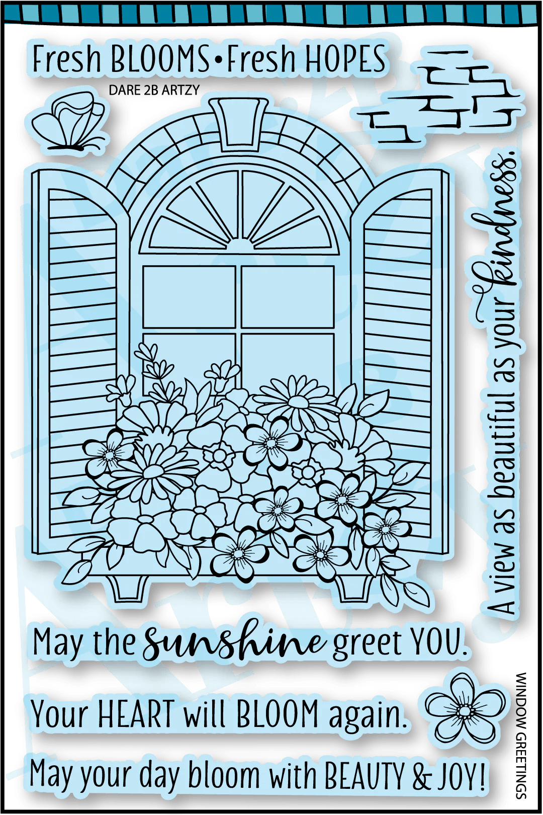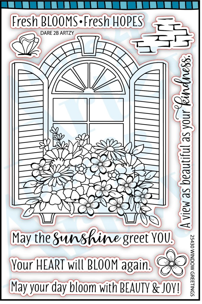 Today my card features the beautiful Window Greeting Stamp set from Dare 2B Artzy. This stamp was the March 2025 Club Stamp for Dare 2B Artzy. The stamp features a large window with a flower box and a type of shutters plus five sentiments, a butterfly and some brick work. It is so beautiful and I knew immediately that I wanted to create a scene with this stamp set when I saw it.