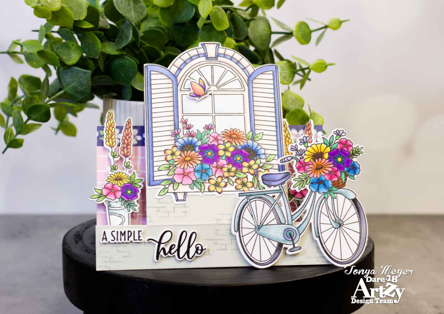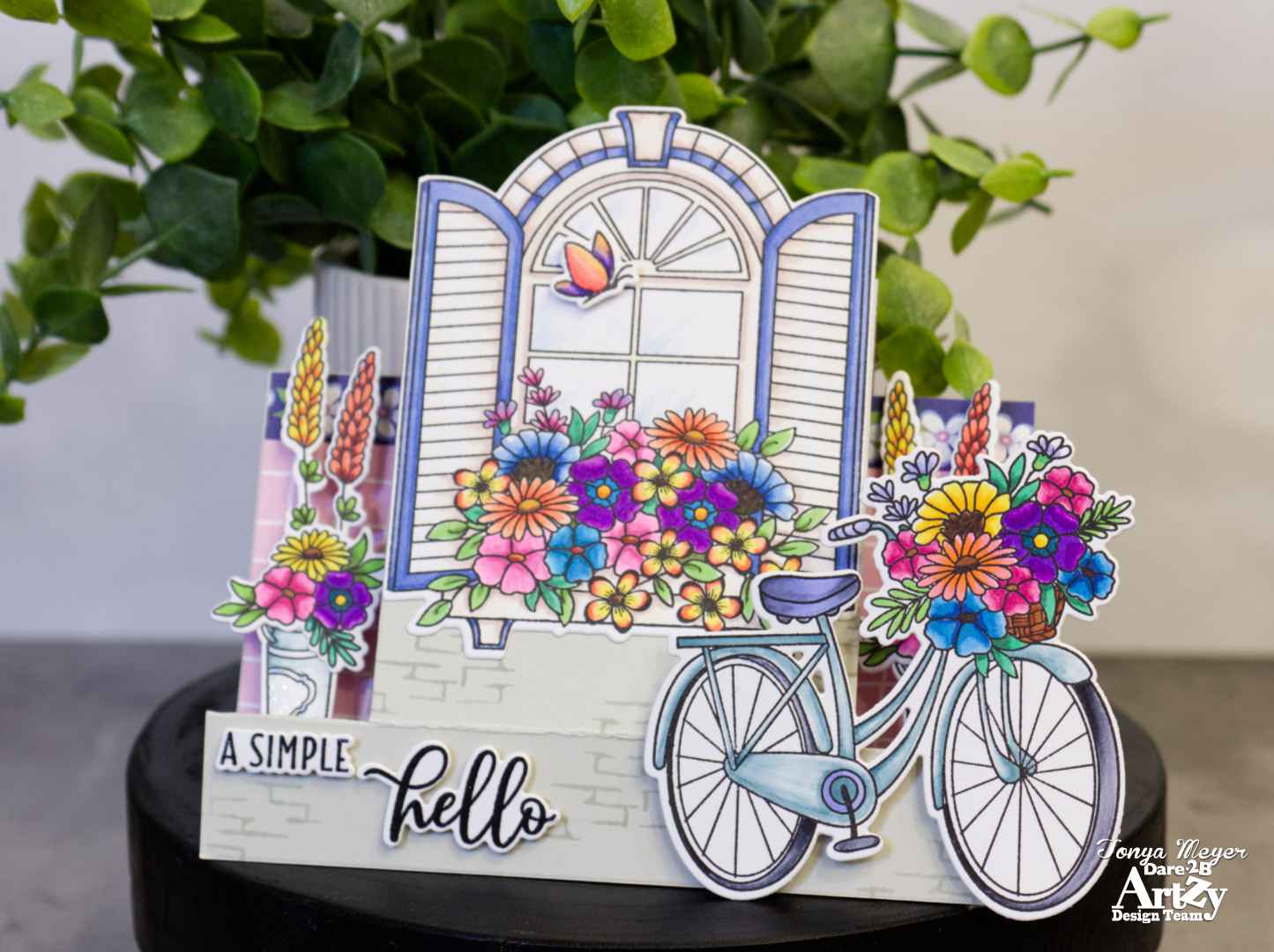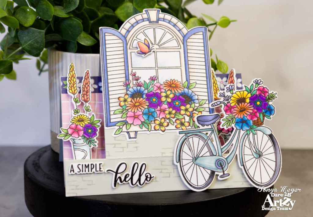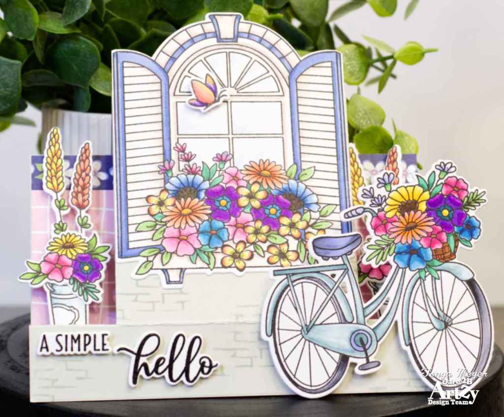 I added a bit of Spectrum Noir sparkle pen to the windows and the bike spokes. Other than that, I didn’t add any additional embellishments because the card has a lot going on with all of the flowers and dimension.