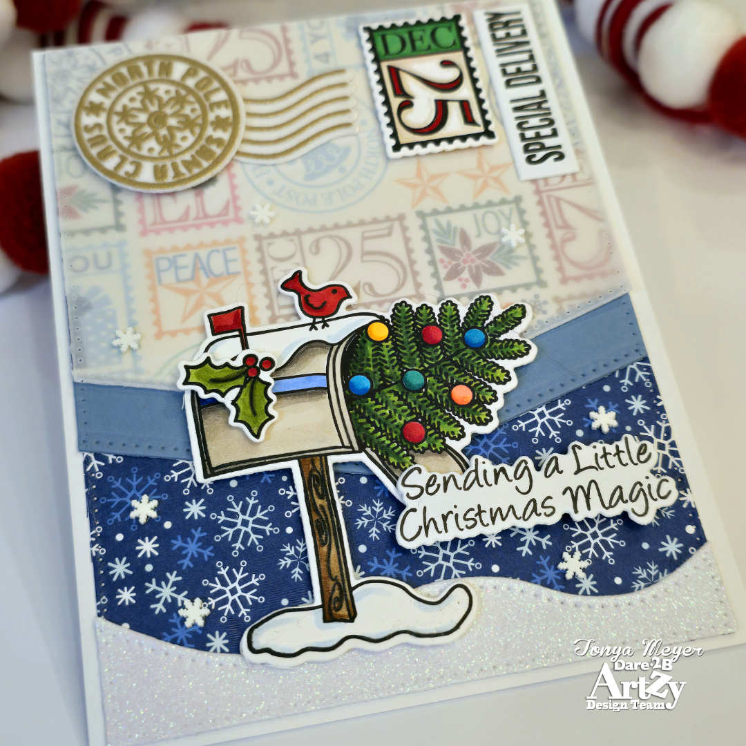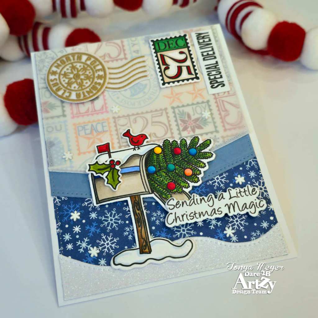 The sentiment “Sending a Little Christmas Magic” and “Dec 25 Stamp” were popped up with foam tape along with the mailbox.