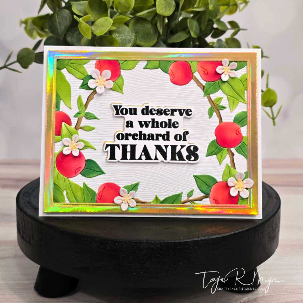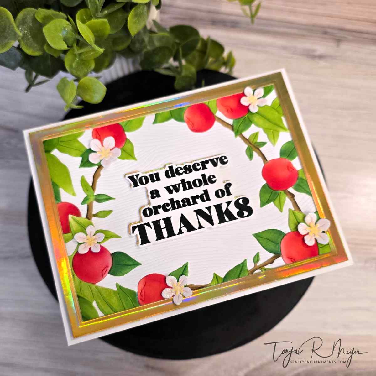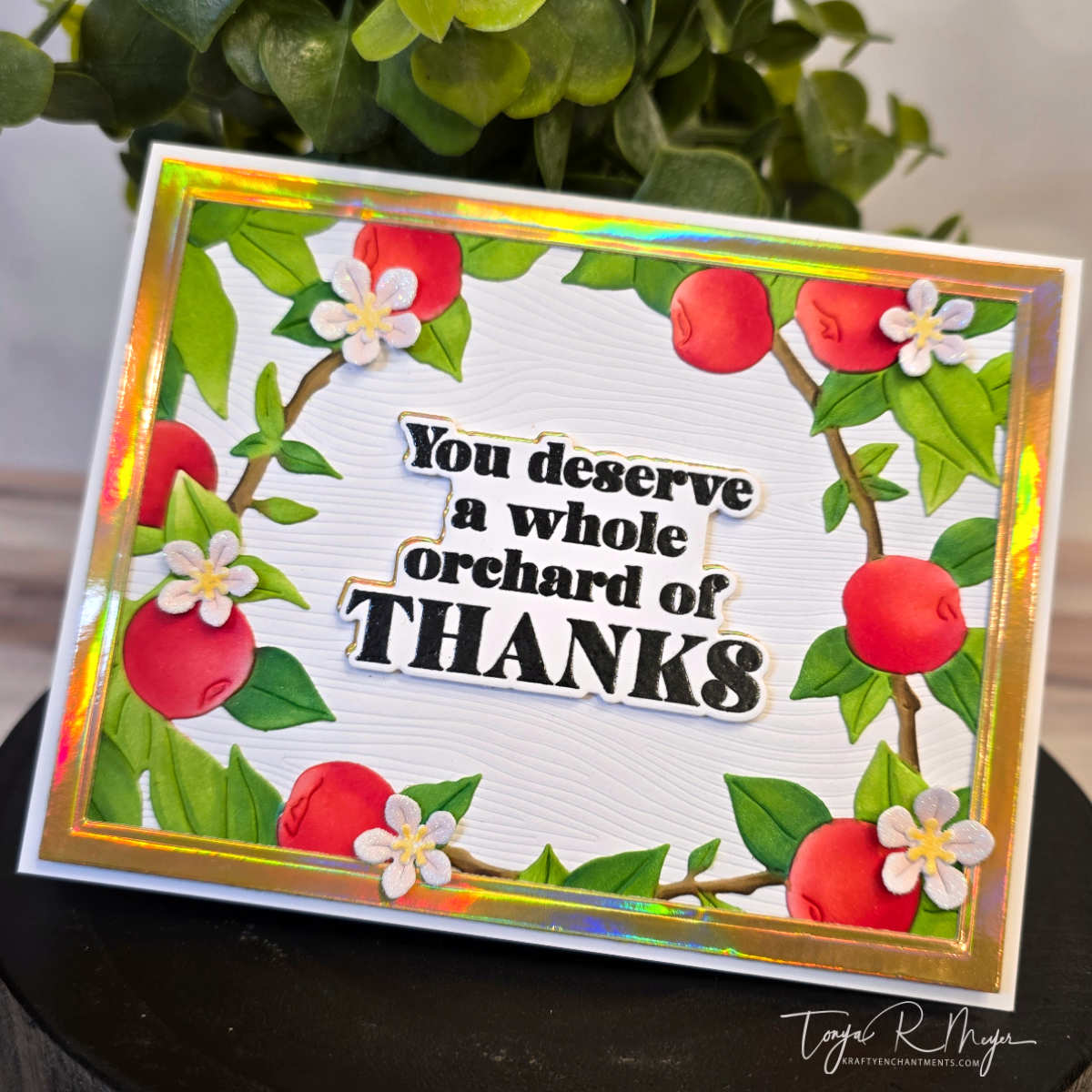 - Sentiment: “You Deserve a Whole Orchard of Thanks” was stamped, embossed, and layered with an offset of foil cardstock for shimmer.