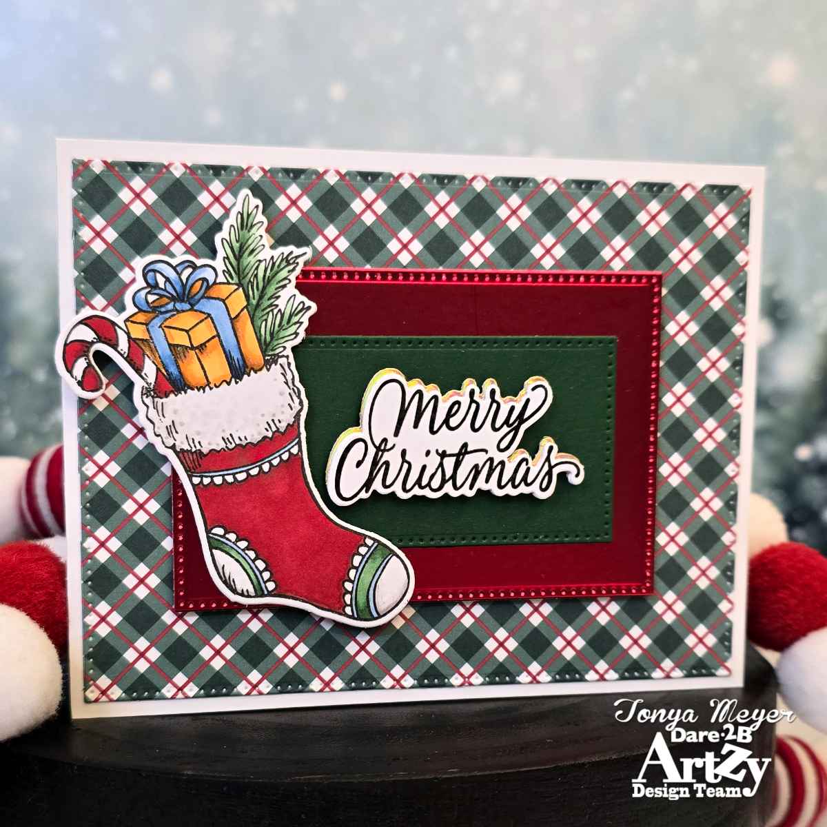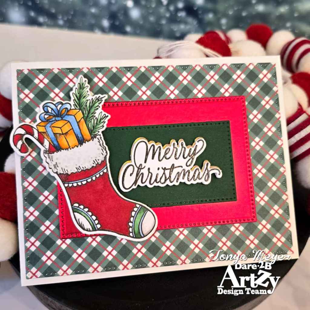 Using Dare 2B Artzy’s Rectangle Framelets and the Festive Prints 6×6 paper pack, I created layered backgrounds with pink and green plaid, snowflakes, glitter, and foil cardstock.