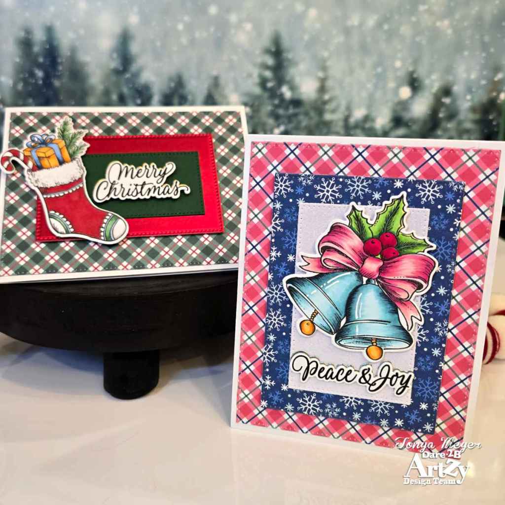 Today I am sharing two charming and easy-to-make Christmas cards using Dare 2B Artzy’s new Peace & Joy stamp and die set—perfect for mass production as the holiday countdown begins! I was motivated by the “90 days to Christmas” reminder on the local news this week. EEEEKK! Where did this year go?