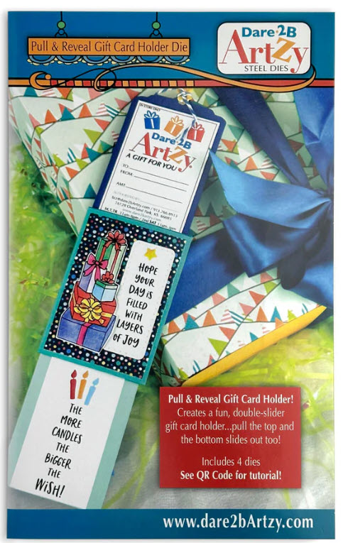 Today, I’m excited to share a project featuring a brand-new die set from Dare 2B Artzy: the Pull and Reveal Gift Card Holder. This die set includes everything you need to create a double-slider gift card holder. There are four dies in total—one main die that cuts a tri-fold base for assembling the holder, and three additional dies you can use to decorate and embellish it. These extra dies can also be used on their own; one is a tag shape that’s perfect for holiday gift tags.