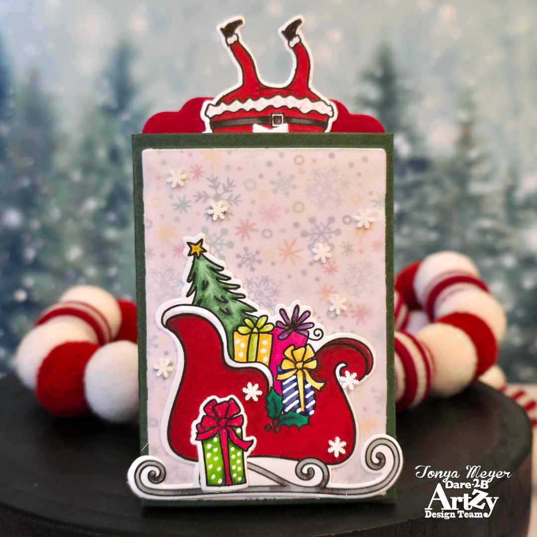 Next, I added the colored image of Dear Santa stuck in the chimney. I glued only the lower part of the image (his belt and pants) to the red tag, creating a little flap that holds the gift card. I attached the sentiment strip “Santa’s a Little Behind” with just a bit of glue where it overlaps the chimney.