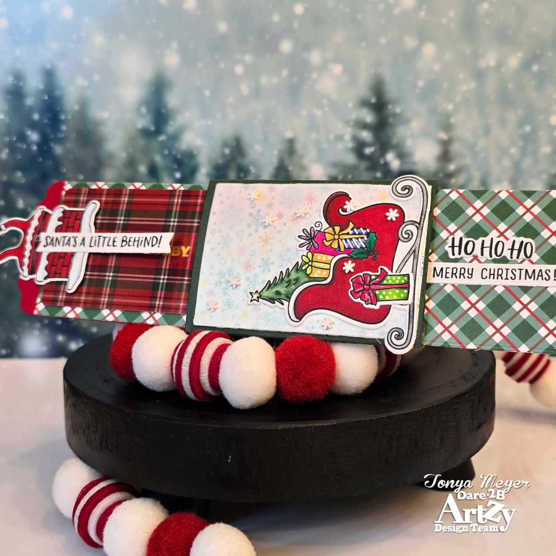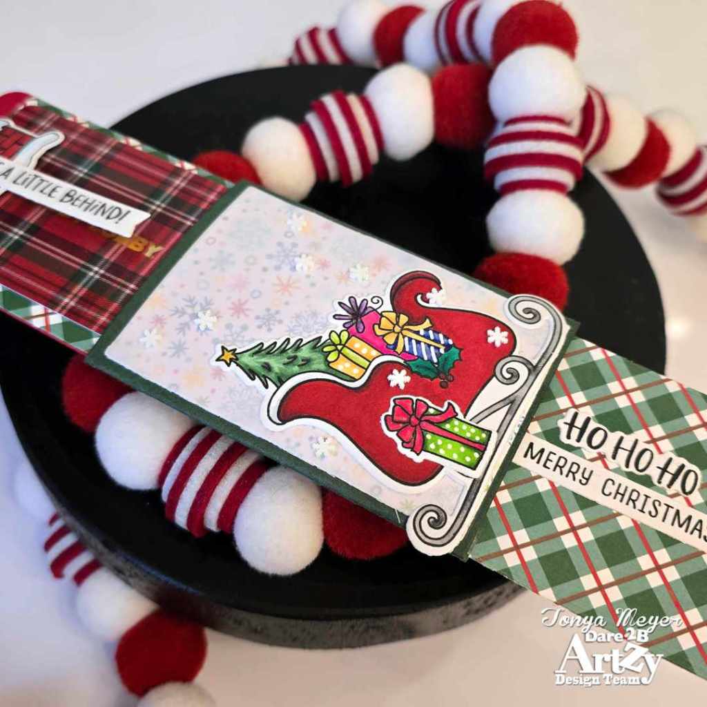 At the top of the slider, I used the tag die from the set, cutting it from red cardstock. The rectangular pull-out panel is cut from the red and green plaid paper, also from the Festive Prints pack—one of my holiday favorites from Dare 2B Artzy.