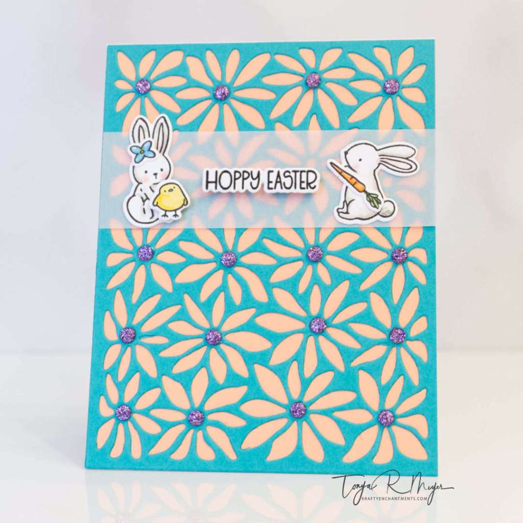 To assemble the focal area, I trimmed a piece of vellum to 4¼” x 1¼”. Using the grid on my glass mat to help with alignment, I adhered the colored images to the vellum strip with liquid glue. I then added the embossed and die cut sentiment “Hoppy Easter” in the center.