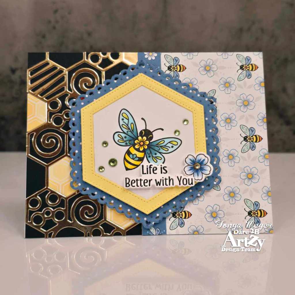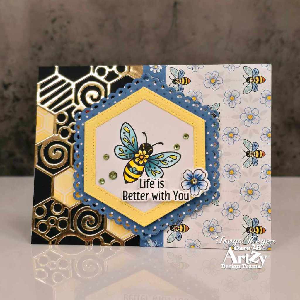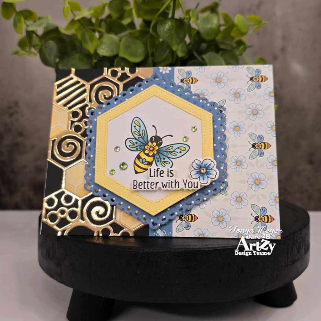 The card base is classic black, A2 size. I layered the honeycomb die cut in gold mirror cardstock across the side, trimming off the extra to fit perfectly. I cut an extra piece of the honeycomb die from some of the honeycomb paper and inlayed 3 of them into the gold mirror cardstock. The alternate side got a cheerful piece of Bitzy Bees paper, and I used a decorative edge to cover the seam so everything feels cohesive.