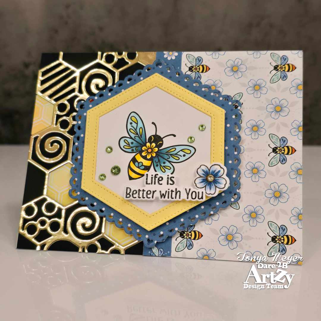 The card base is classic black, A2 size. I layered the honeycomb die cut in gold mirror cardstock across the side, trimming off the extra to fit perfectly. I cut an extra piece of the honeycomb die from some of the honeycomb paper and inlayed 3 of them into the gold mirror cardstock. The alternate side got a cheerful piece of Bitzy Bees paper, and I used a decorative edge to cover the seam so everything feels cohesive.